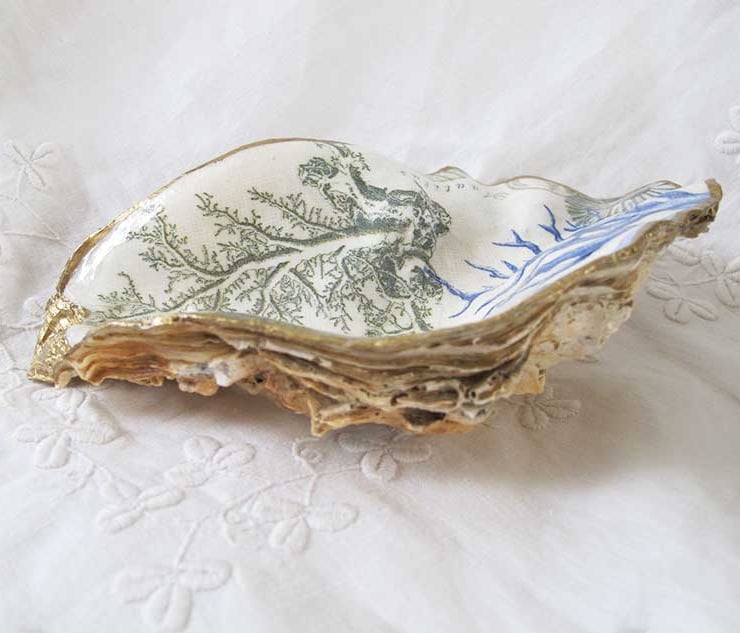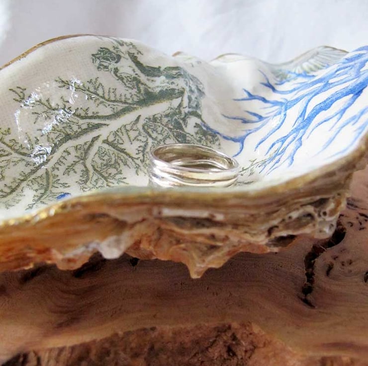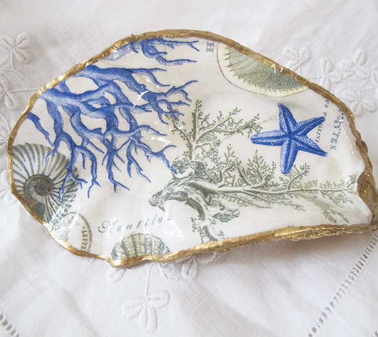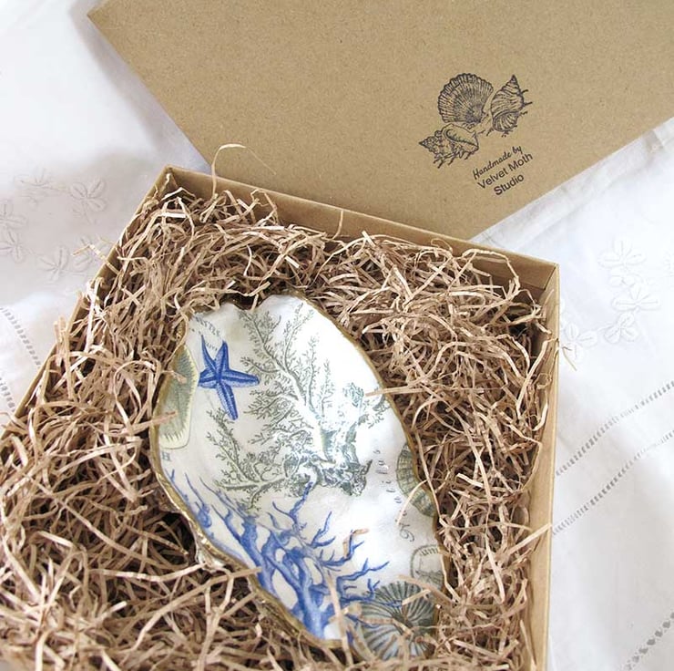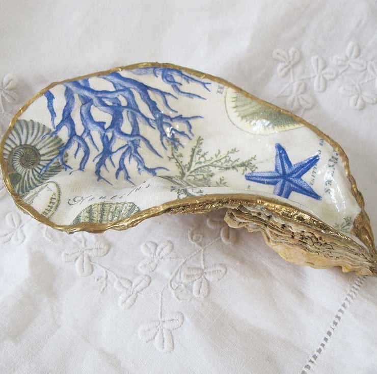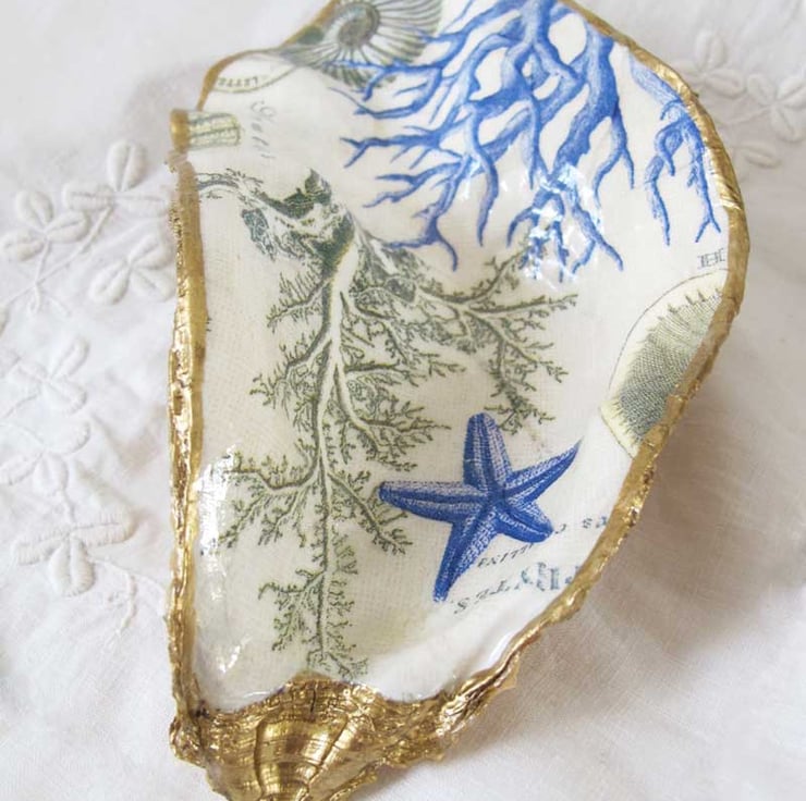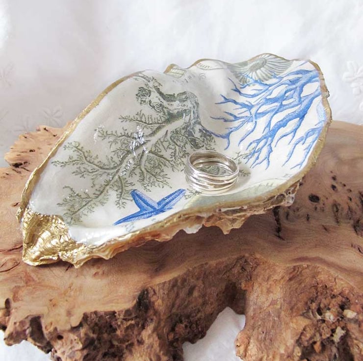A beautiful oyster shell, hand decorated with a decoupaged design of blue and green coral, shells and sealife, with genuine 24ct gold leafing. The shell has been finished with several layers of hard wearing varnish and the back has been left natural and sealed with a coat of matte varnish. This dish measures approximately 17cm long, 10cm wide and 5.5cm deep.