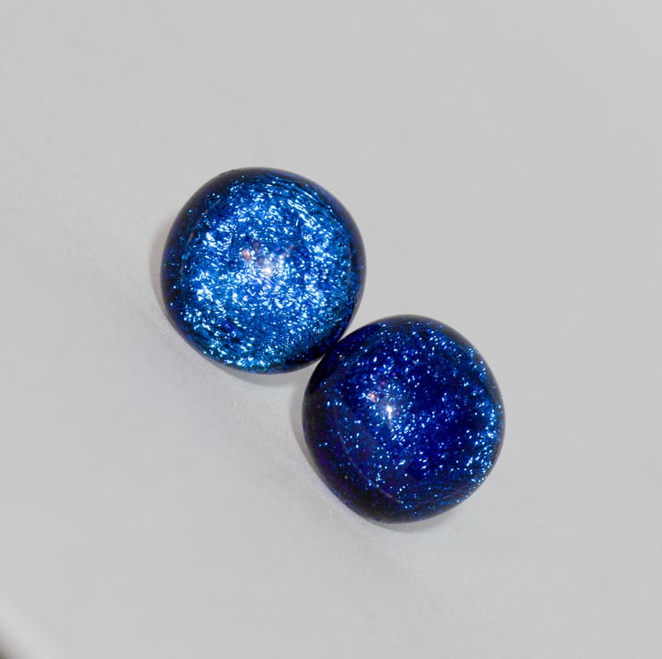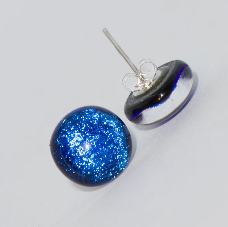 Each earring is approximately 1.25 cm in diameter and is made from hand-cut glass which has been fused at around 800C in our kiln. This process creates a totally smooth surface.