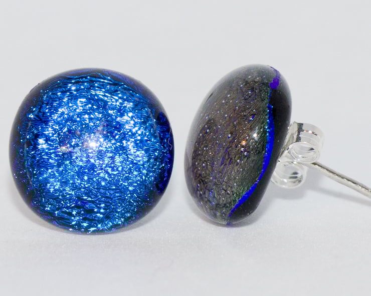We have a range of earrings created from dichroic glass - we love working with it. The colours that Dichroic Glass show continues to amaze and surprise us. When we open the kiln we are always looking to see what the kiln-fairies have been up to.