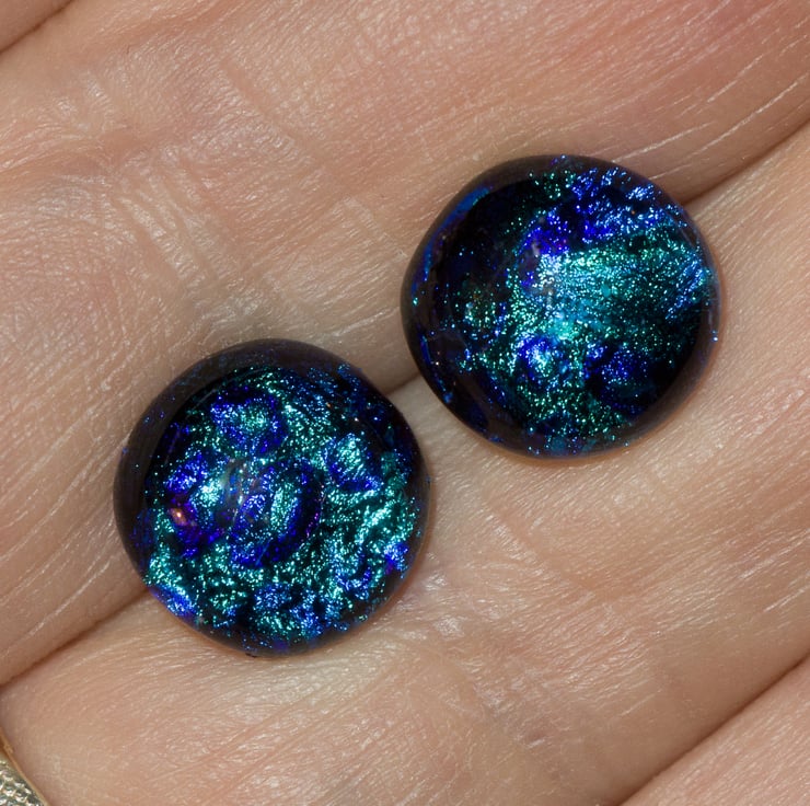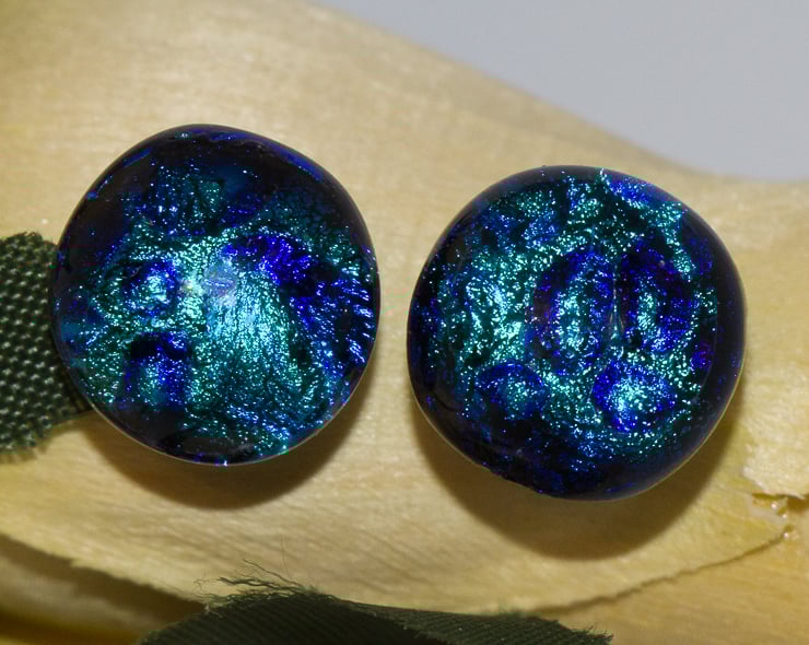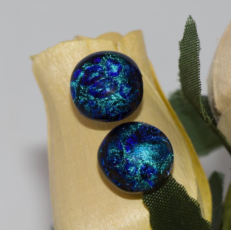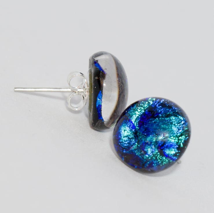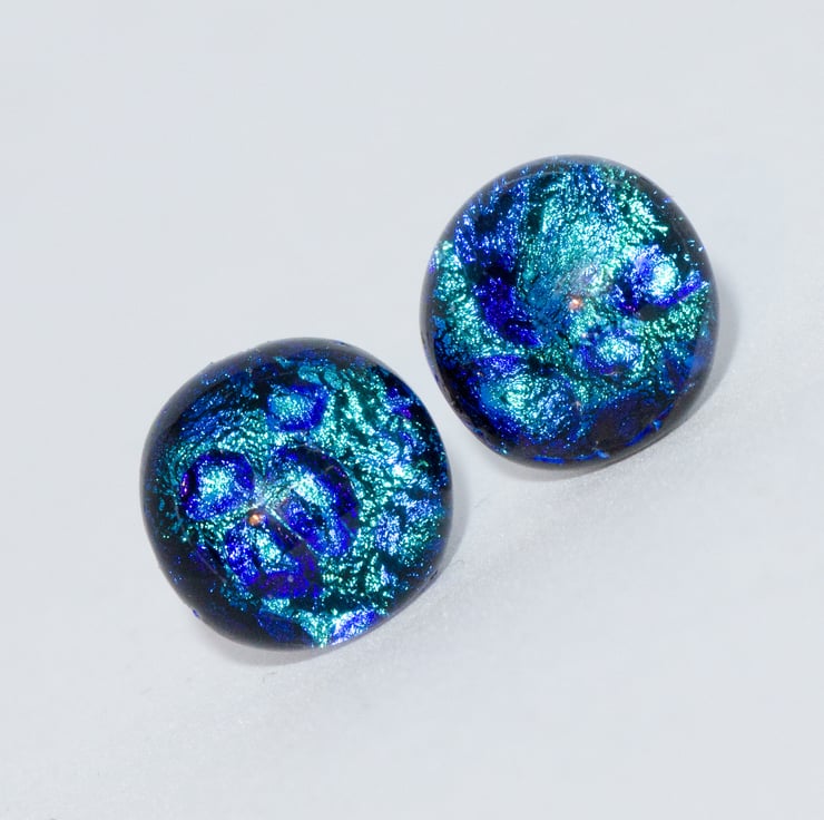 We have a range of earrings created from dichroic glass - we love working with it. The colours that Dichroic Glass shows continue to amaze and surprise us. When we open the kiln we are always looking to see what the kiln-fairies have been up to.