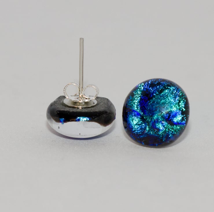 Each earring is a rounded square that measures approximately 1.2 cm across and is made from hand-cut glass which has been fused at around 800C in our kiln. This process creates a totally smooth surface.