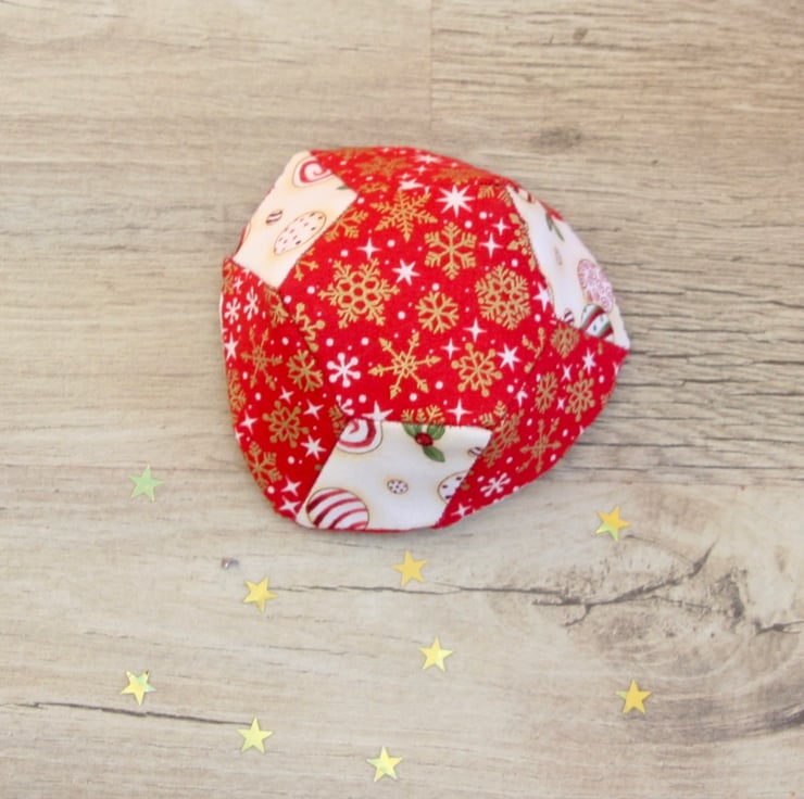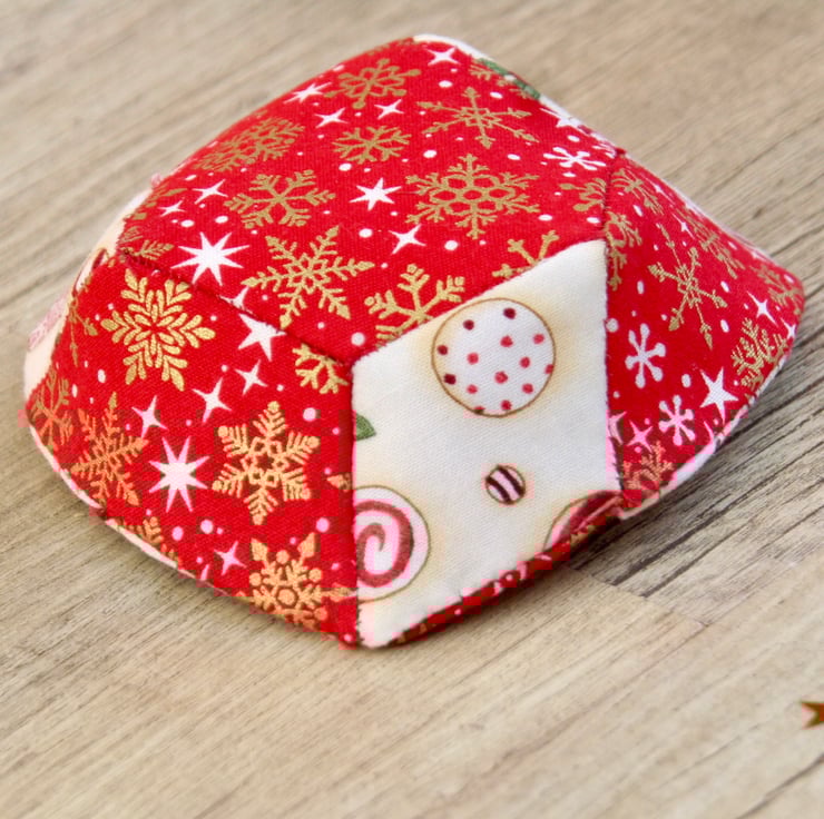 It features scraps of festive material in red and cream reinforced with some interfacing to give the basket some structure. The basket is hand-sewn throughout using hexagon and diamond shapes. The base is approximately 7 1/2 cm (3 inches) across at its widest point and the sides are approximately 4 cm (1 1/2 inches) high.