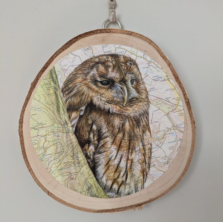 The Tawny Owl print is drawn over a map that includes Cropton Forest and the Raptor Viewpoint in Yorkshire