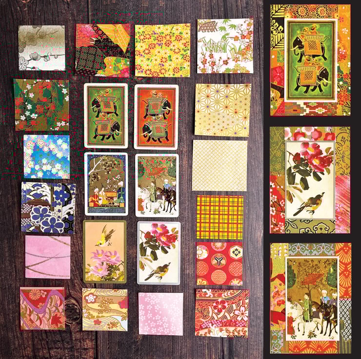 The sidebar shows how they can be used to create colourful little artworks. You can add your own decorative papers - from old books, journals, wallpapers etc. The mini collages can be used to make cards, gift tags, decorate the front of notebooks or even framed as gifts. See the following photos for examples of some of the recent items I've made.