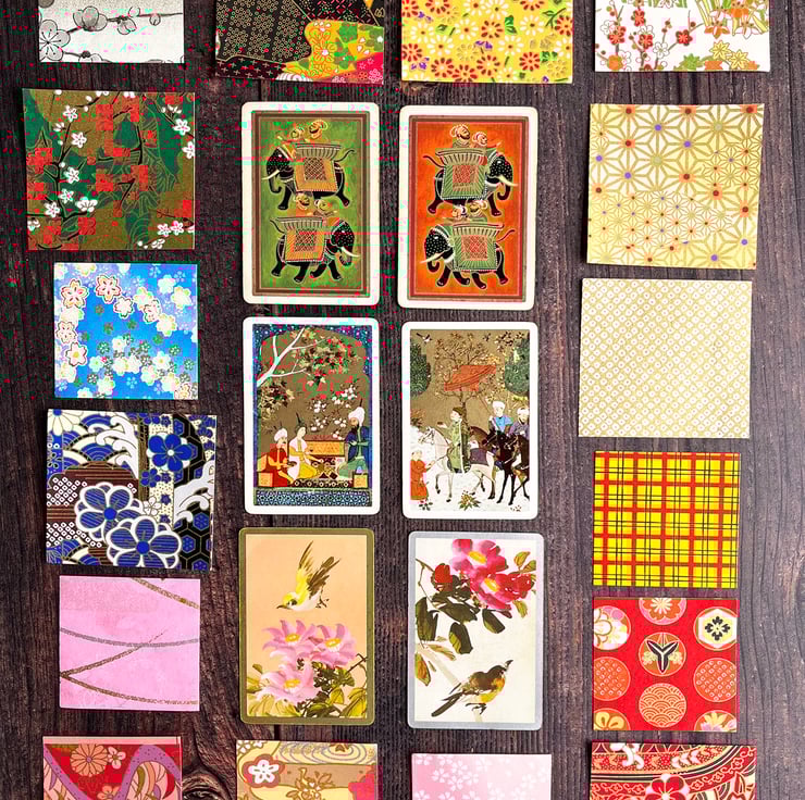 This craft bundle consists of three pretty pairs of vintage playing cards and an assortment of colourful origami papers. Papers are a mix of 6cm and 7cm square.
