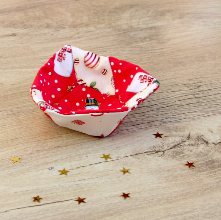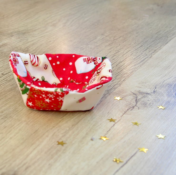This little patchwork fabric basket is perfect for putting out some little treats or to hold some festive scented pot pourri.