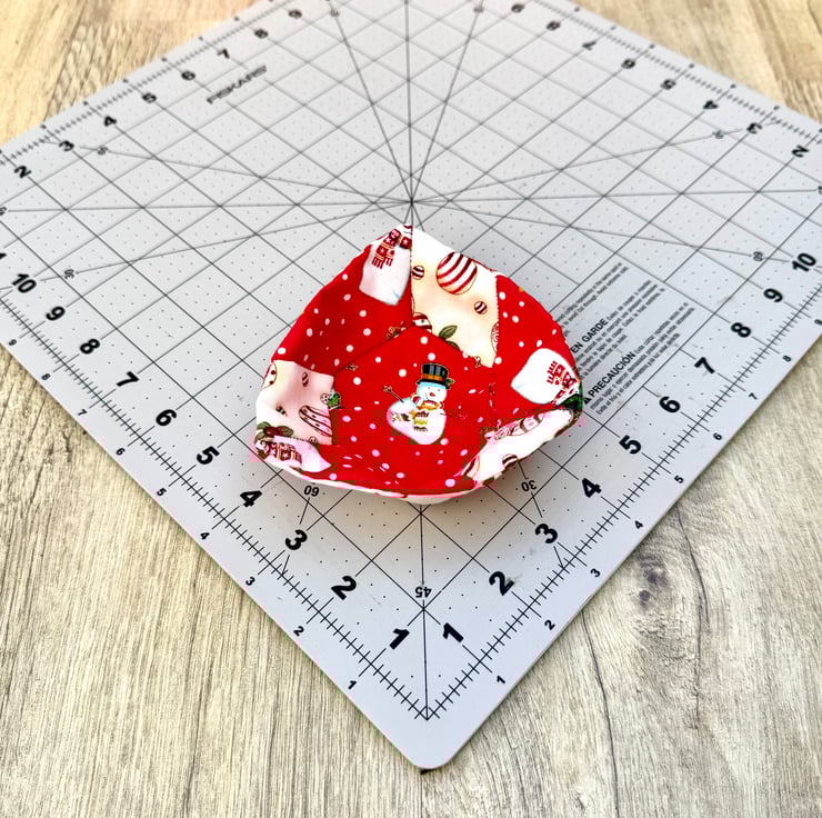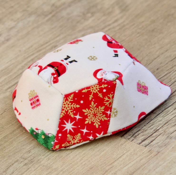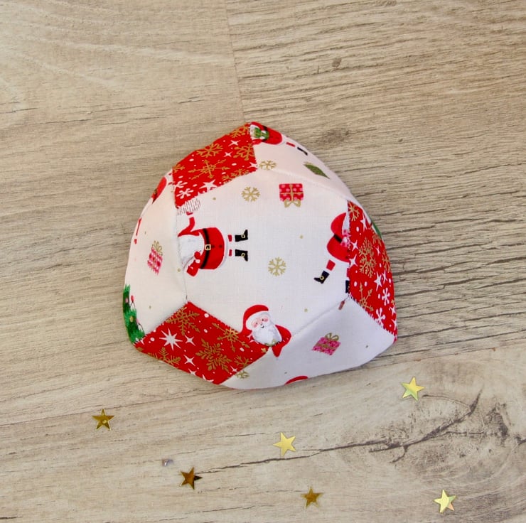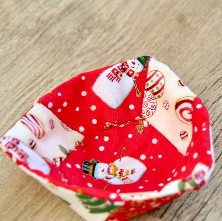 It features scraps of festive material in red and cream reinforced with some interfacing to give the basket some structure. The fabric includes some Snowmen and Santas. The basket is hand-sewn throughout using hexagon and diamond shapes. The base is approximately 7 1/2 cm (3 inches) across at its widest point and the sides are approximately 4 cm (1 1/2 inches) high.