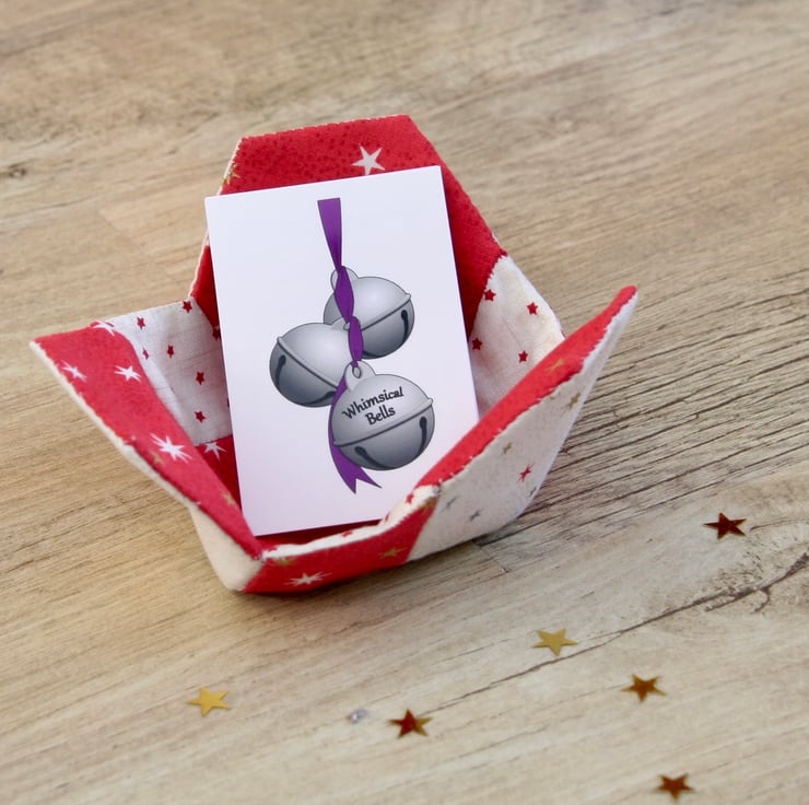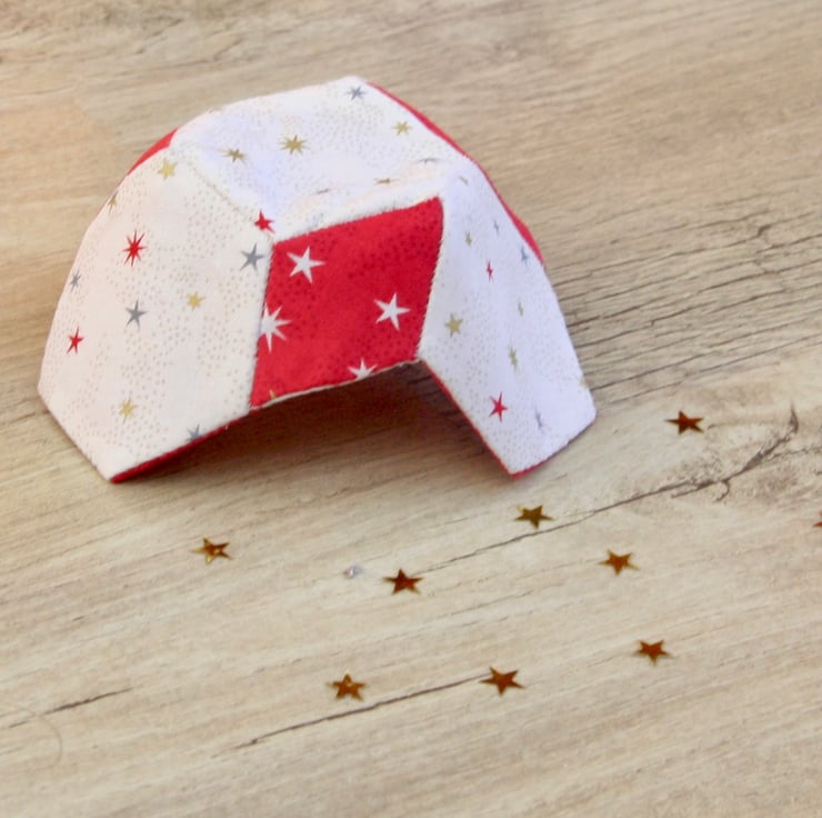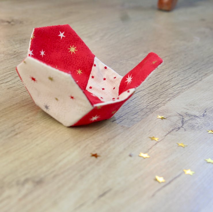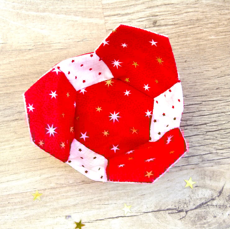 It features scraps of festive material in red and white, sprinkled with stars, reinforced with some interfacing to give the basket some structure. The basket is hand-sewn throughout using hexagon and diamond shapes. The base is approximately 7 1/2 cm (3 inches) across at its widest point and the sides are approximately 7 cm (2 3/4 inches) at their highest points.