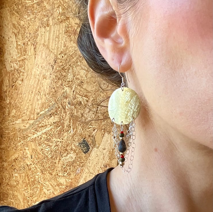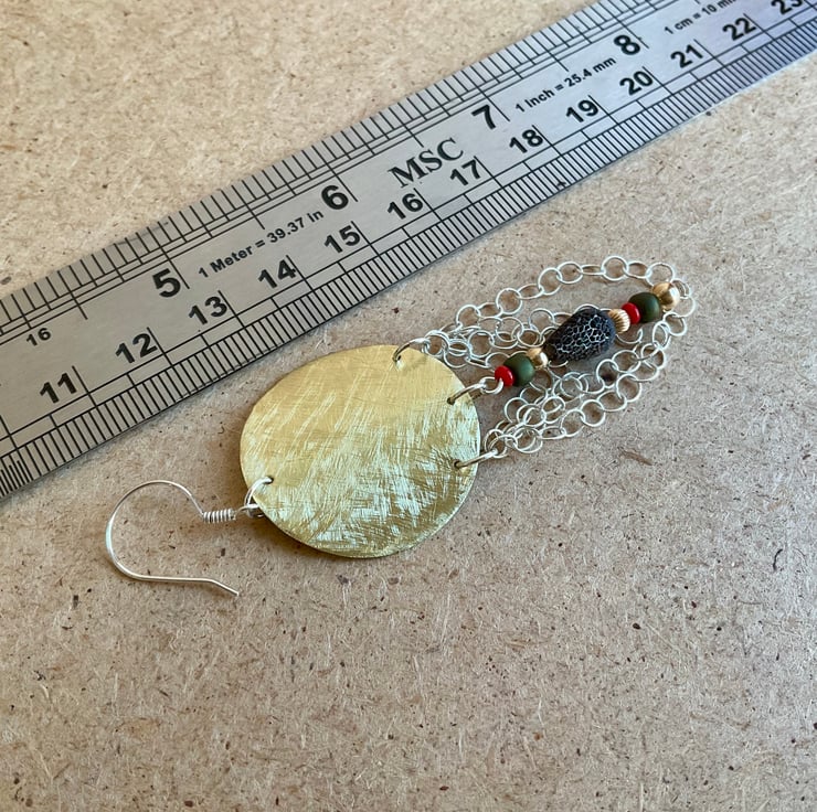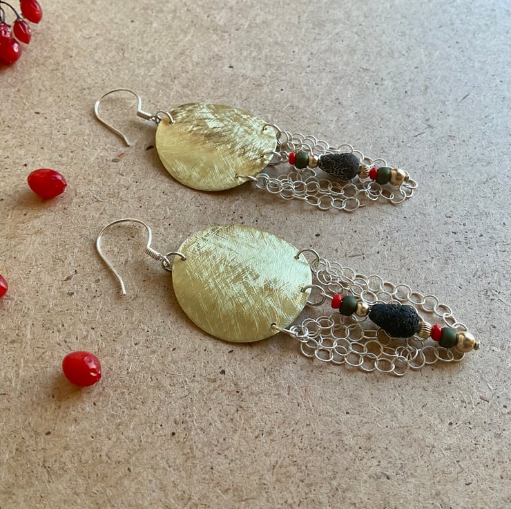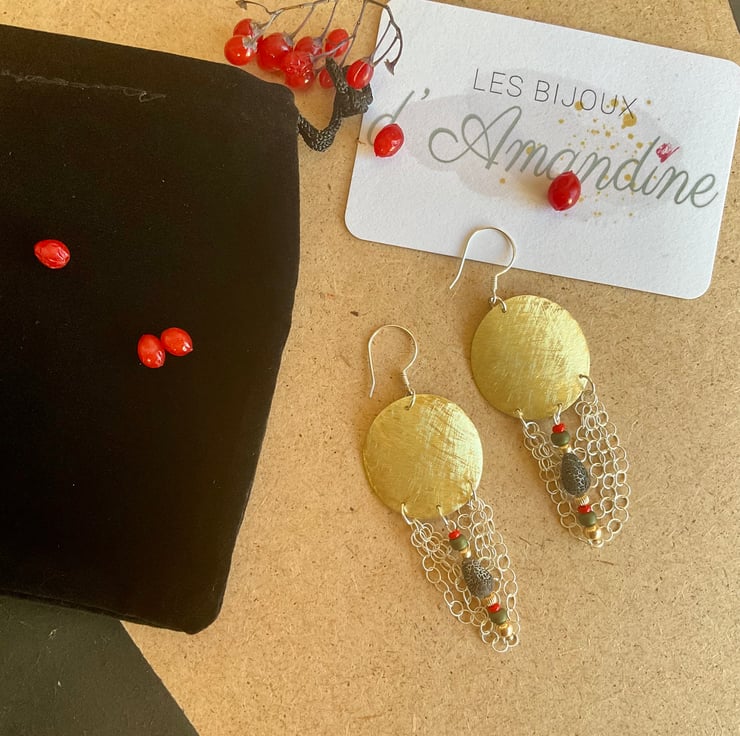 A bold blend of rustic textures and colourful accents, these bohemian style earrings feature brass main elements from which dangles a silver chain. Natural weathered agate are paired with red green and gold beads to complete the pair, adding a discreet touch of colour.