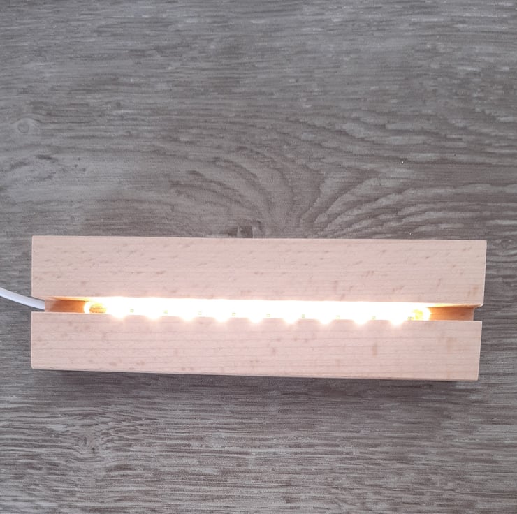 Acrylic Photo Frame with LED lamp in a rectangular wooden base.
