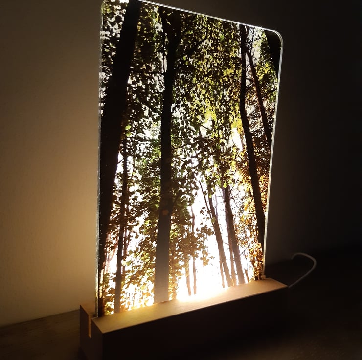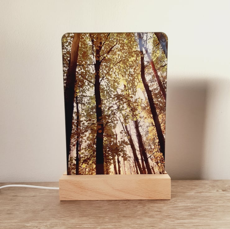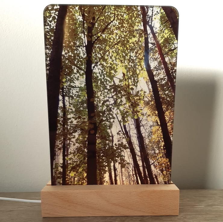 The lamp features an original woodland photograph taken in the Staffordshire Moorlands. During the day the frame can be enjoyed as a photograph, when you switch on the lamp you'll be transported into the woodland with the sunlight streaming through the trees!
