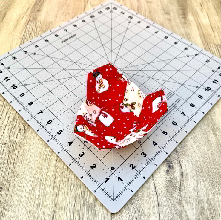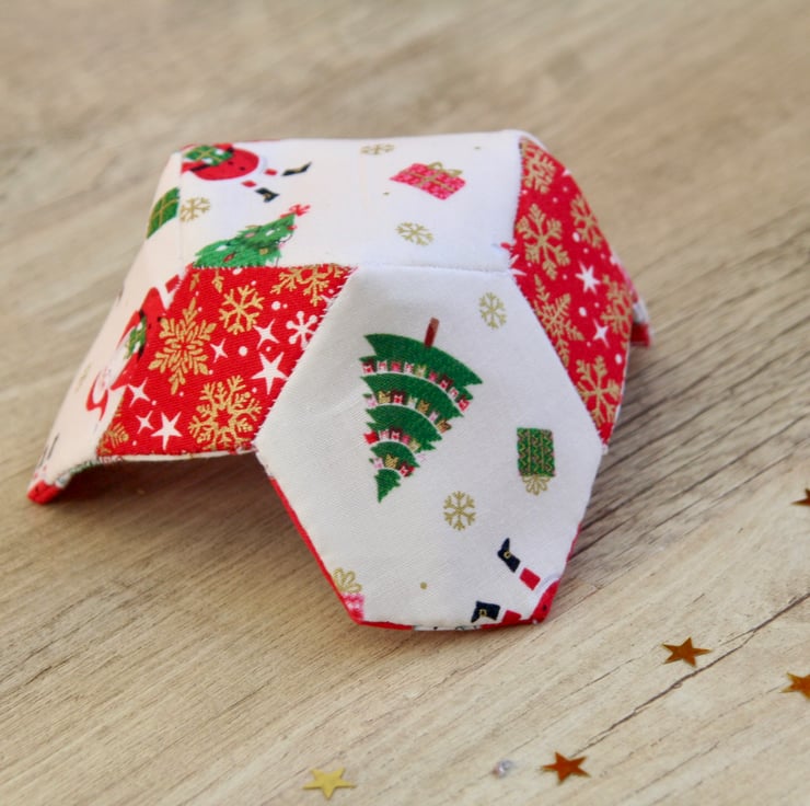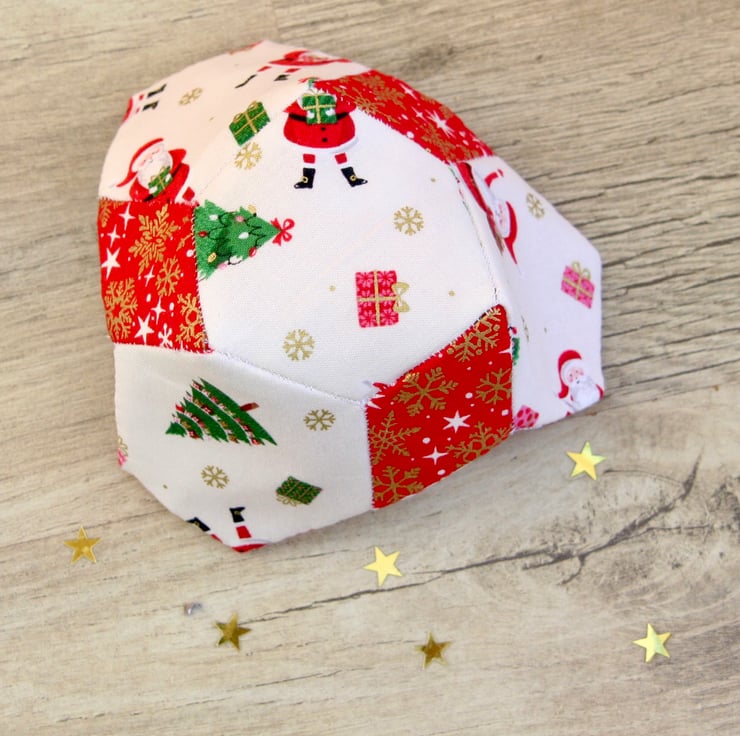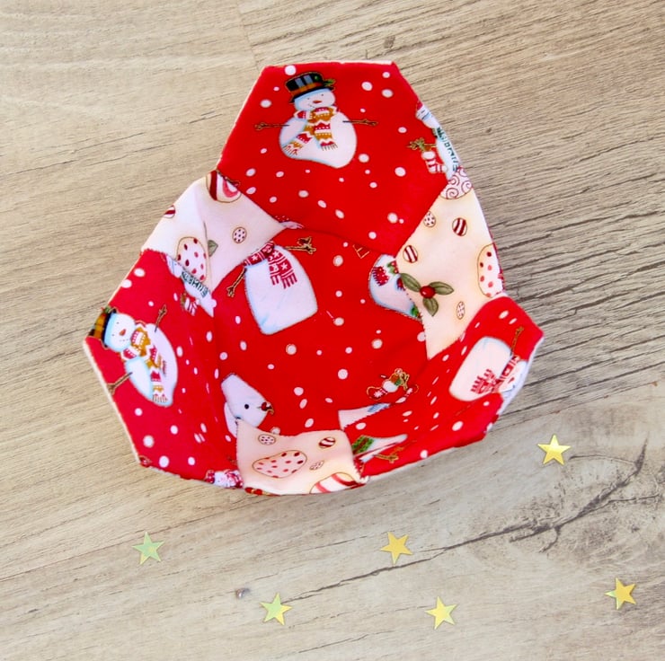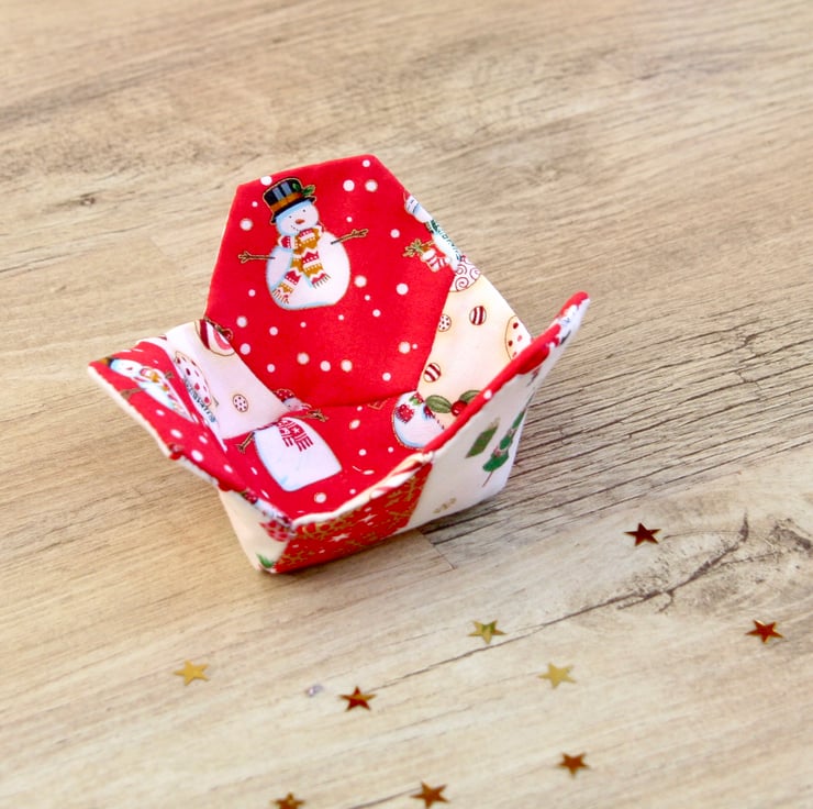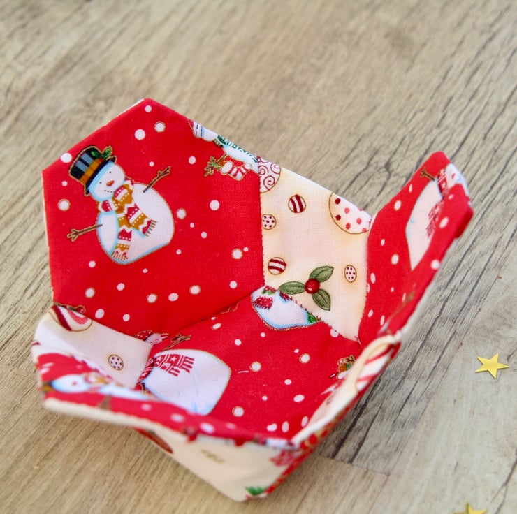 It features scraps of festive material in red and cream, sprinkled with Snowmen, Baubles, Santas and Trees. The fabric has been reinforced with some interfacing to give the basket some structure. The basket is hand-sewn throughout using hexagon and diamond shapes. The base is approximately 7 1/2 cm (3 inches) across at its widest point and the sides are approximately 7 cm (2 3/4 inches) at their highest points.