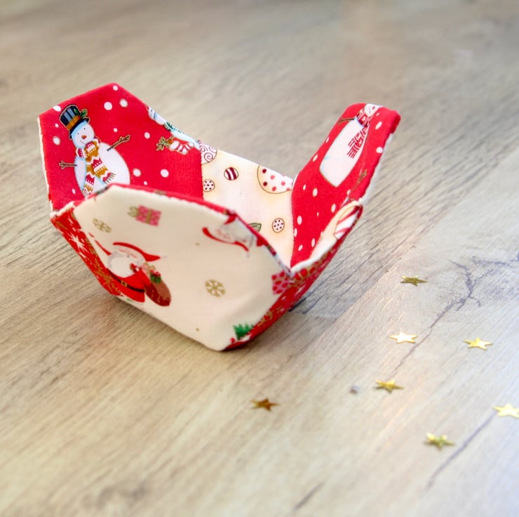 This little patchwork fabric basket is perfect for putting out some little treats or to hold some festive scented pot pourri.