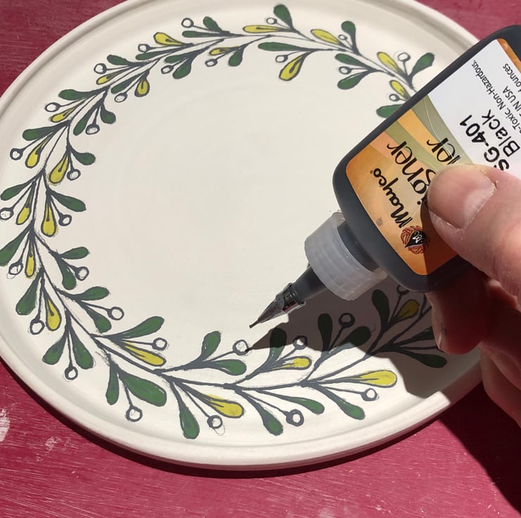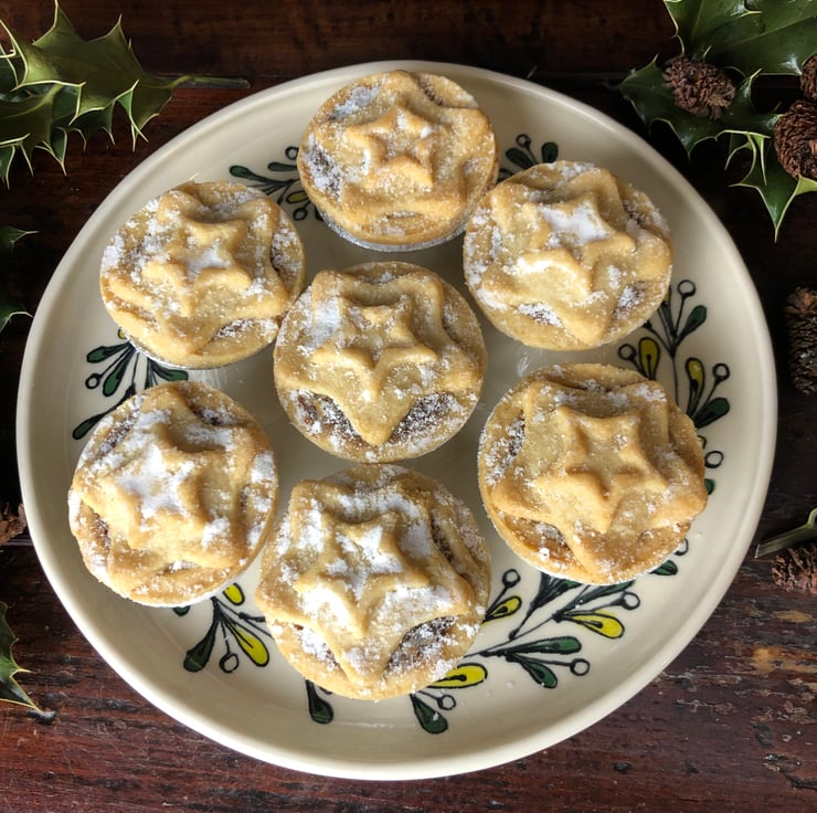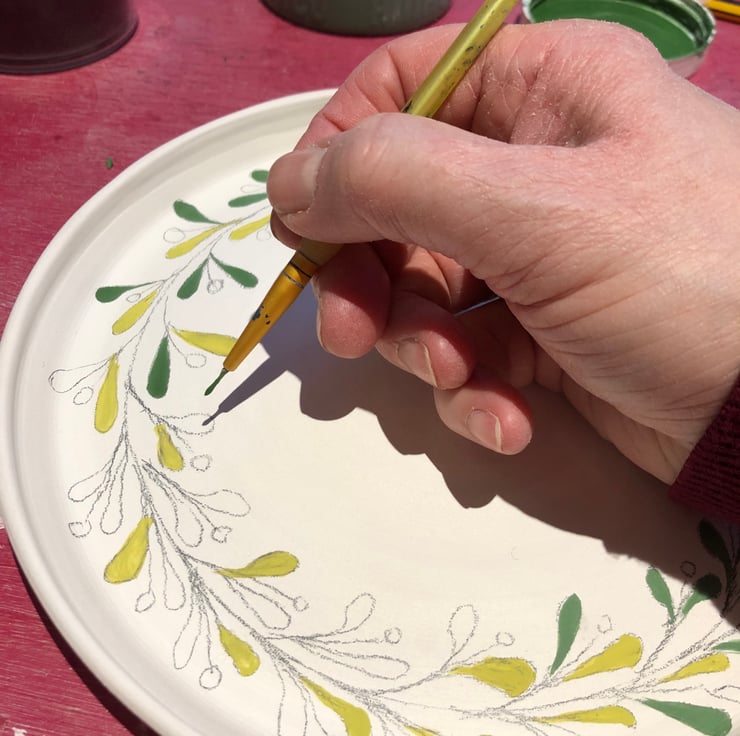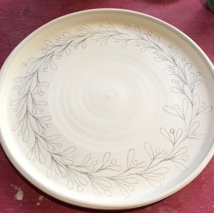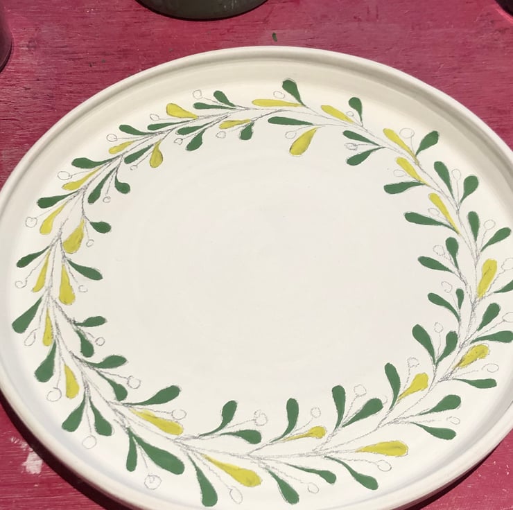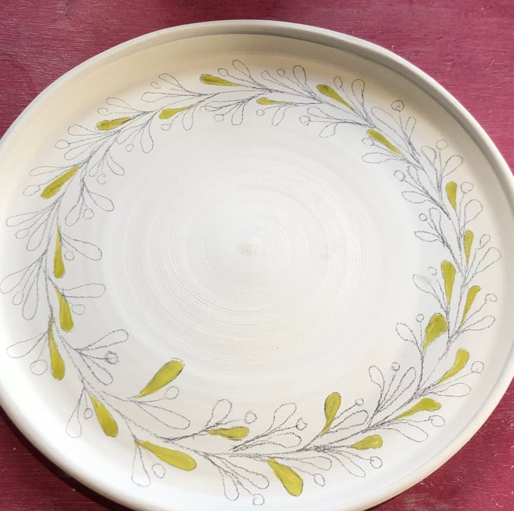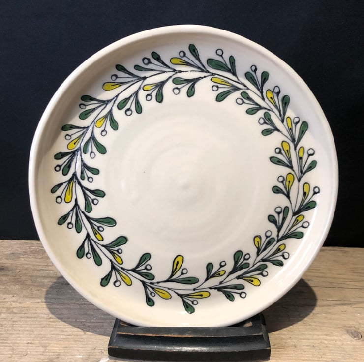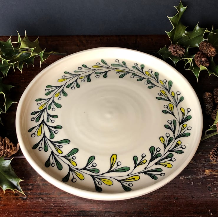 A wheel thrown stoneware plate with a hand painted wreath of mistletoe. The perfect size for serving a small pile of mince pies or festive biscuits. It's one of a kind!