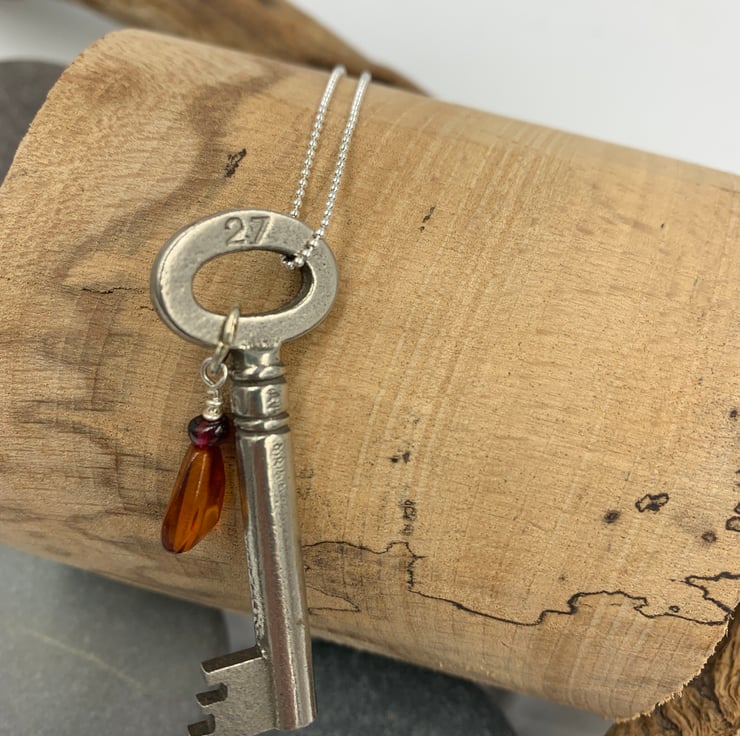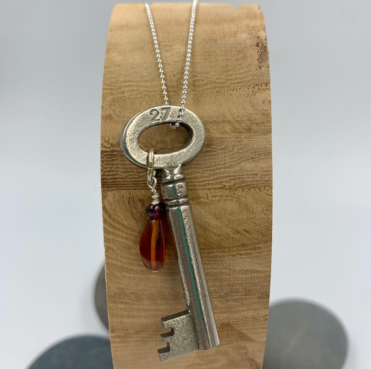 This charming whimsical necklace features an antique key, measuring 5cm in length, complemented by a delicate turquoise and aquamarine charm. The key hangs from an 18” sterling silver ball chain and features the number ‘27’ on one side. With its vintage-inspired design and playful color combination, it's a perfect quirky gift for a special occasion—whether it's a 21st birthday or just a thoughtful surprise!