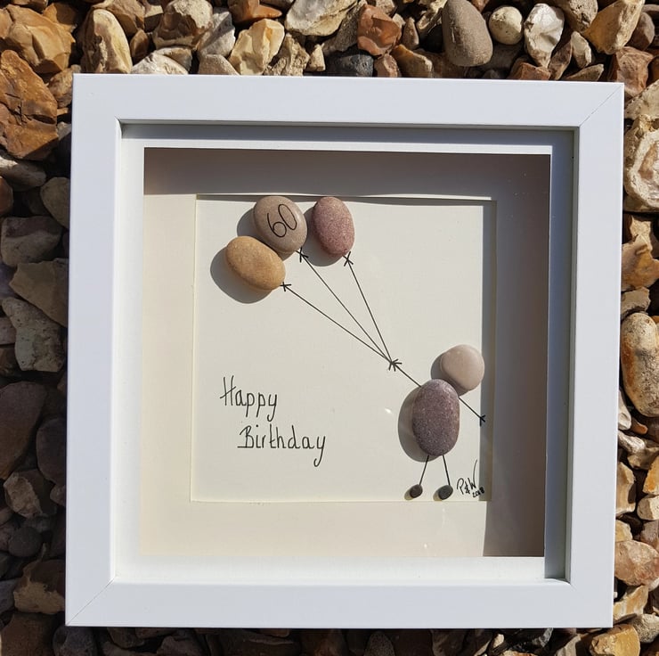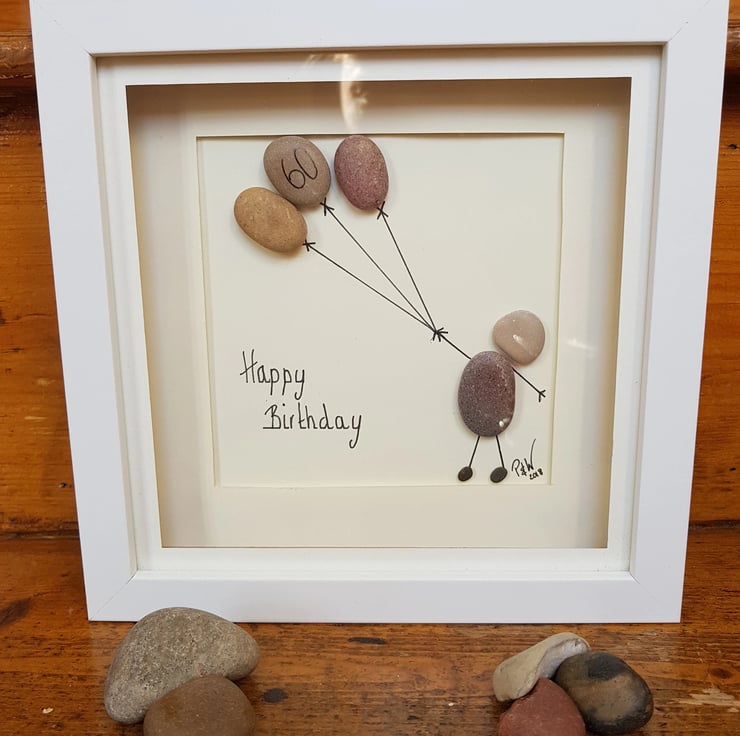A truely unique, one of a kind, beautiful handmade pebble art “Happy Birthday” picture that can be personalised to create a picture that is unique to everyone. This picture can have a name added along with the birthday message and the balloon can have any age painted onto it or simply be left blank be left blank.