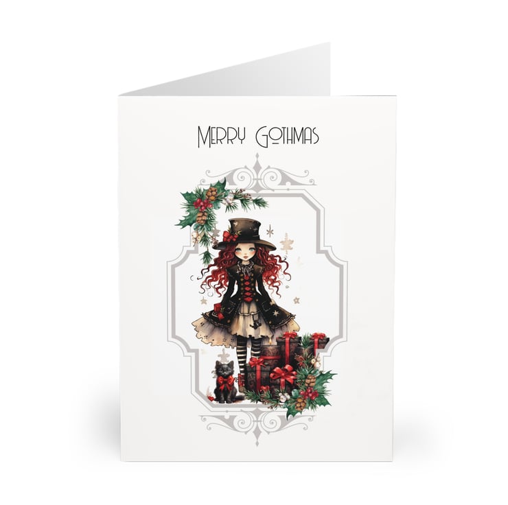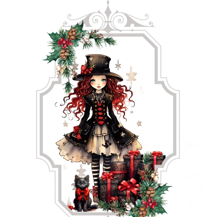 Struggling to find a card for the Goths in your life? This cute Christmas / Gothmas design features a red-haired Kawaii style Goth Girl dressed in Black Victorian clothes and stripey stockings. She wears an oversized top hat and has a little black cat and a pile of red-ribboned presents at her feet. The entire scene framed within an Art Nouveau frame sprinkled with holly and berries.