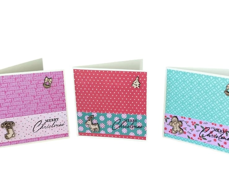 These 4 x 4 inch cards have a cream card base which has been layered with festive paper. Little wooden embellishments have been added such as reindeer, gingerbread people, bells and Christmas trees, these are made by us and have been laser engraved and cut out.
