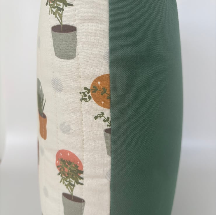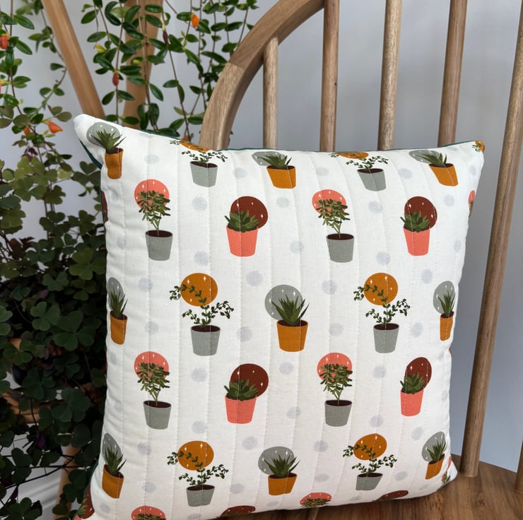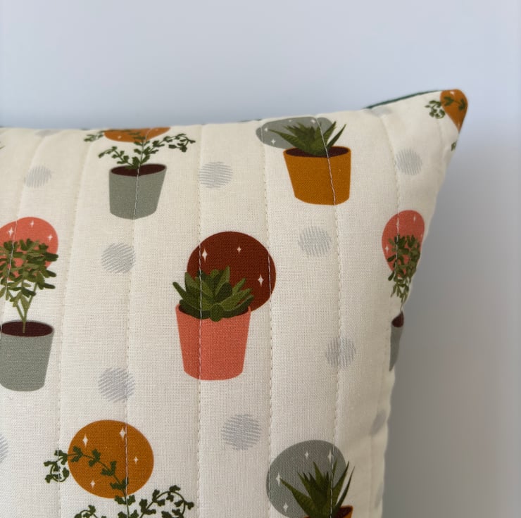 Perfect for houseplant lovers! I’ve used parallel line quilting to attach soft cotton, with a fun houseplant design, to light wadding and calico. The cushion is backed with a plain cotton curtain fabric in dark green, and it is finished with an invisible zip.