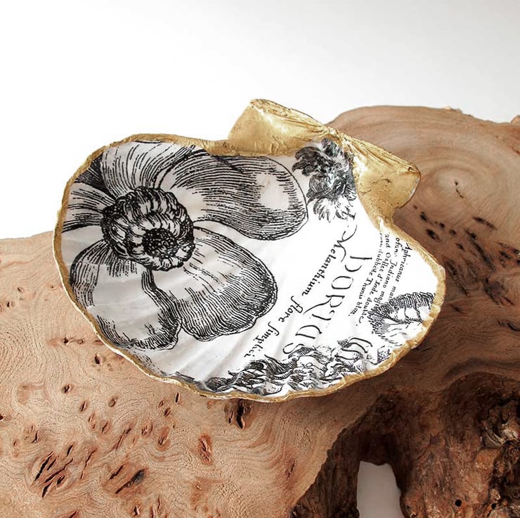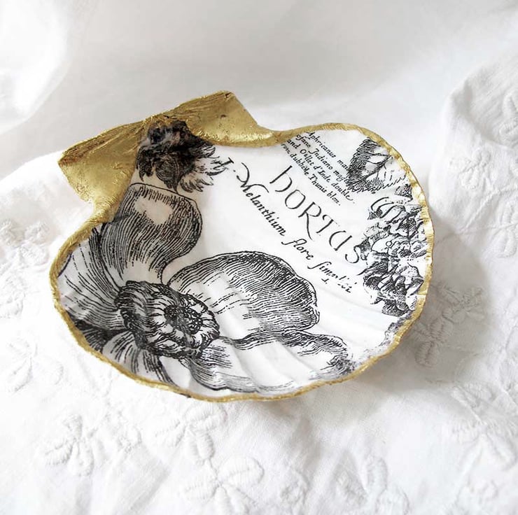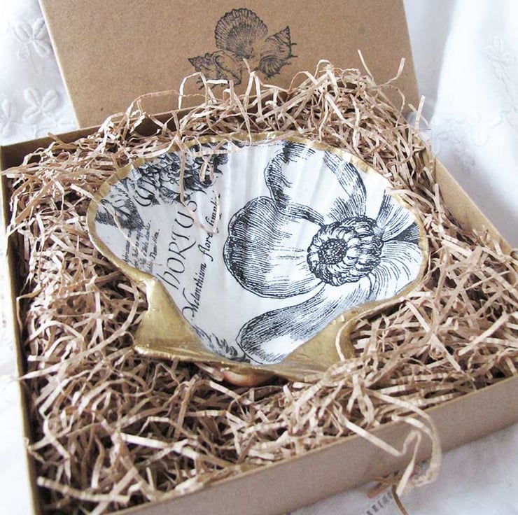 A beautiful scallop shell, hand decorated with black and white floral decoupage and gold leafing. The shell has been finished with several layers of hard wearing varnish and the back has been left natural and sealed with a coat of matte varnish. This dish measures approximately10cm long, 11cm wide and 3cm deep.