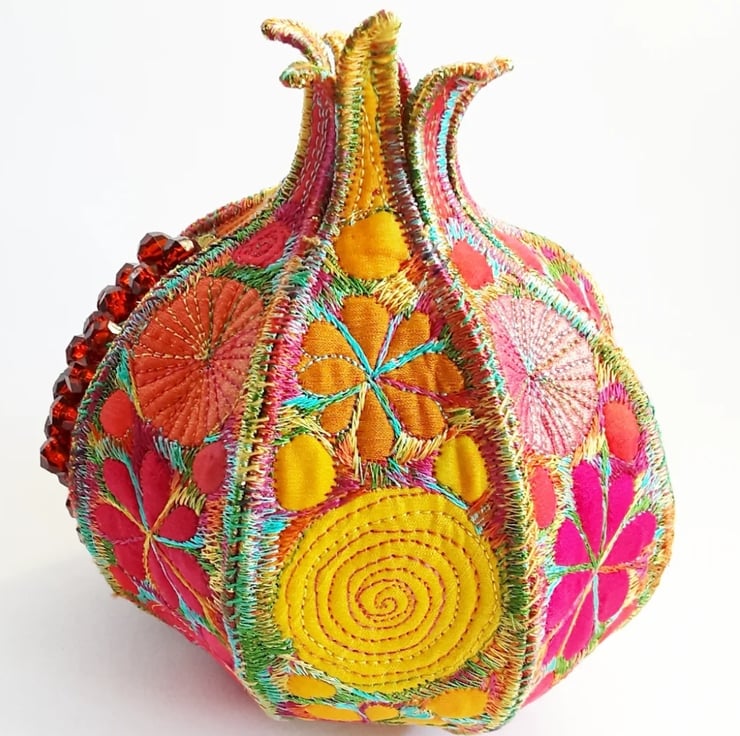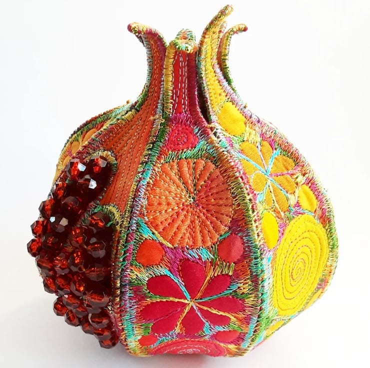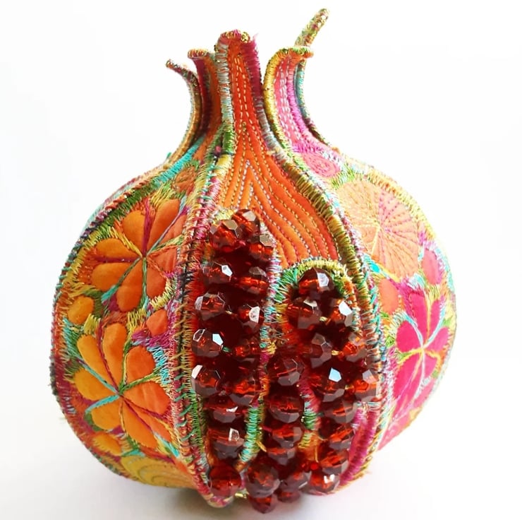 This is a handmade textile pomegranate decoration with beads to represent the seeds coming out of one of the segments.