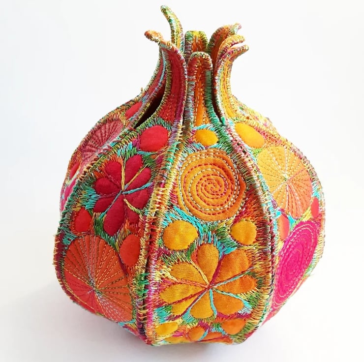 Made from layers of fabric including hand dyed Egyptian cotton and silk fabrics sewn together using the free machine embroidery style of sewing and applique