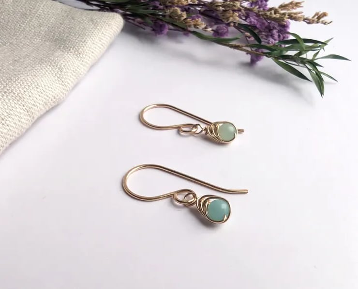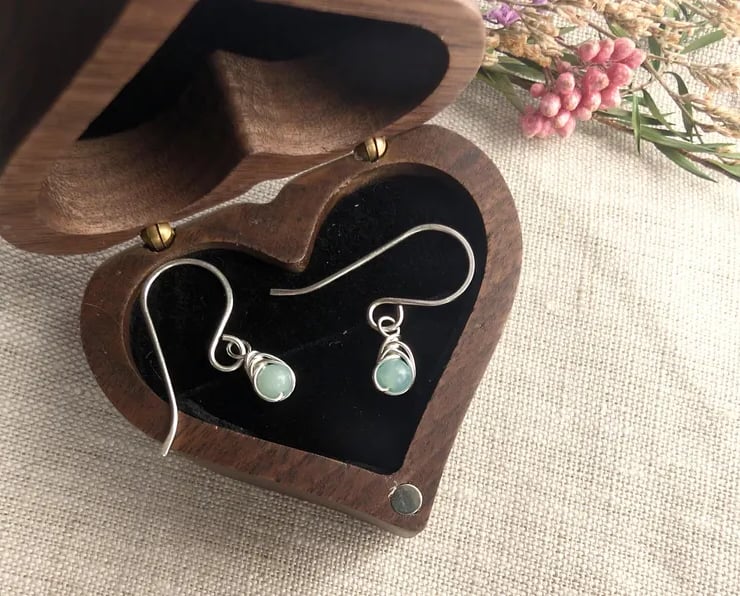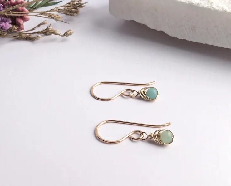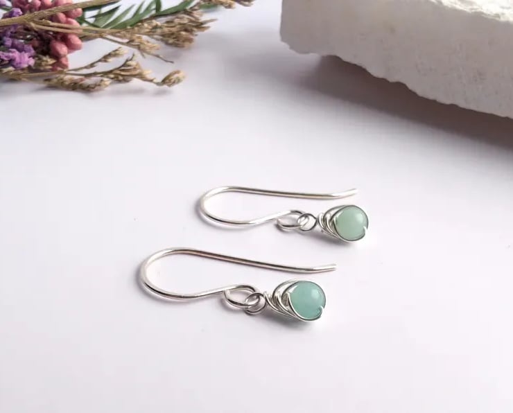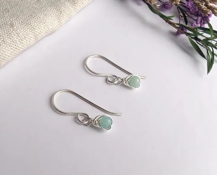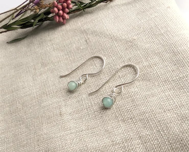 Dainty sterling silver dangle earrings featuring amazonite beads. Small amazonite beads wire wrapped in a herringbone weave to form a frame around the gemstones. The colour of the stones varies from light to medium blue shade. These earrings would make a lovely gift for yourself or a loved one.