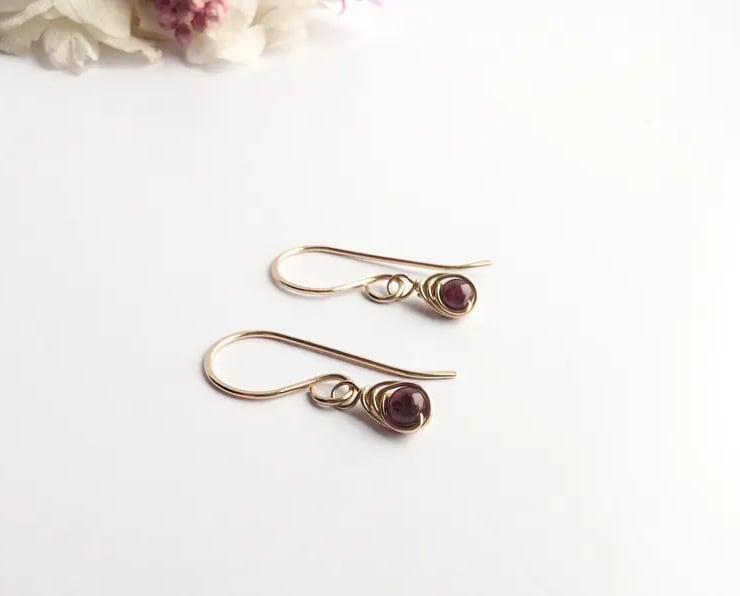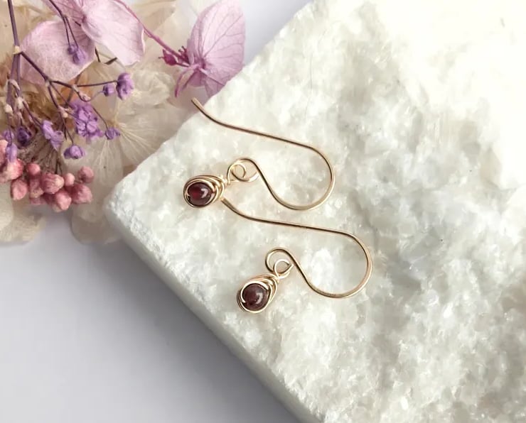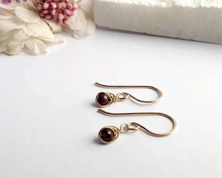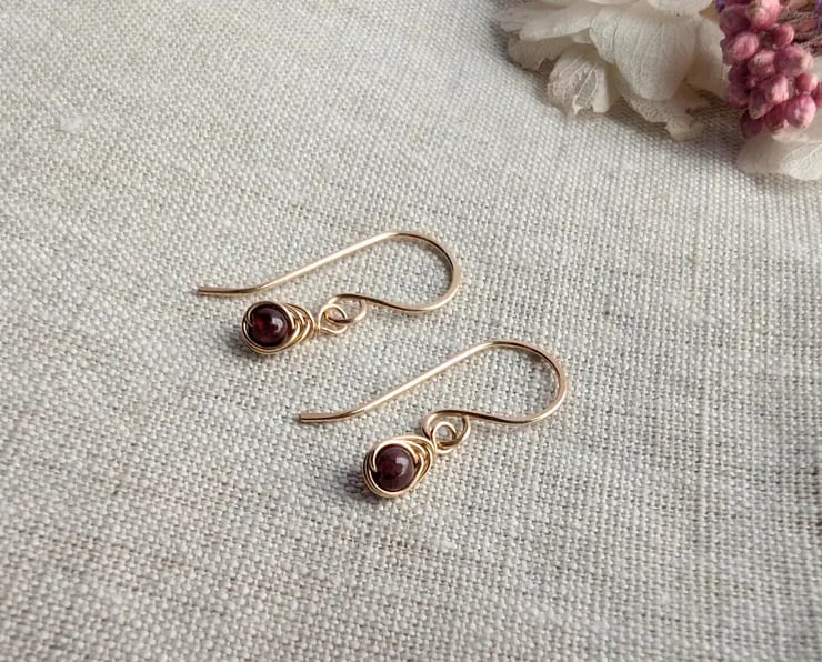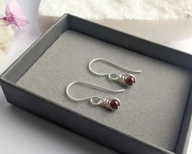 Dainty sterling silver dangle earrings featuring garnet beads. Small moss agate beads wire wrapped in a herringbone weave to form a frame around the gemstones. These earrings would make a lovely gift for yourself or a loved one.