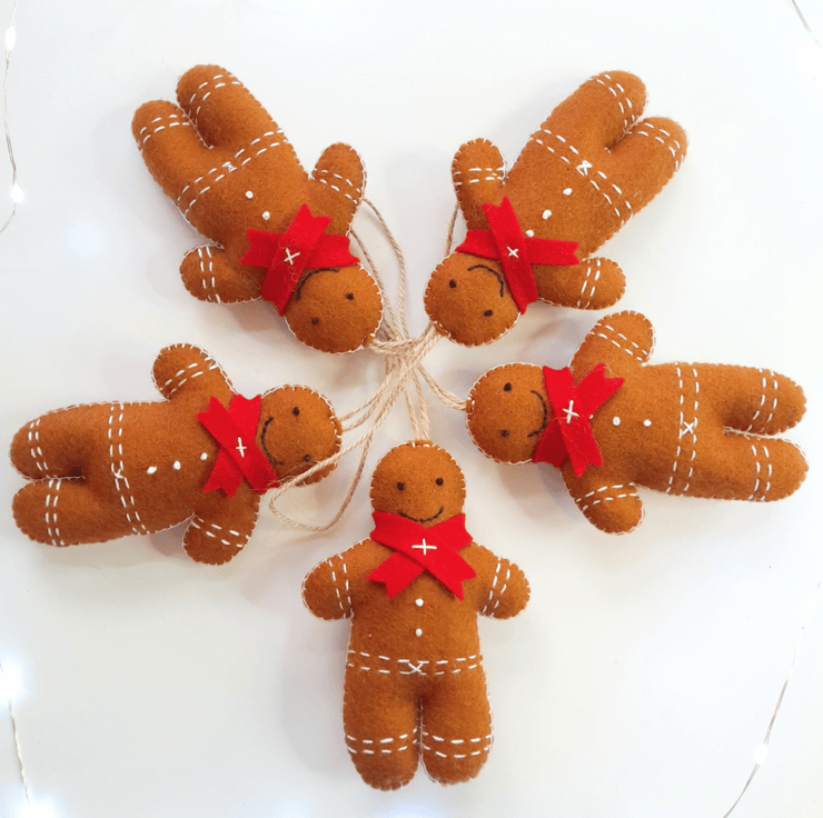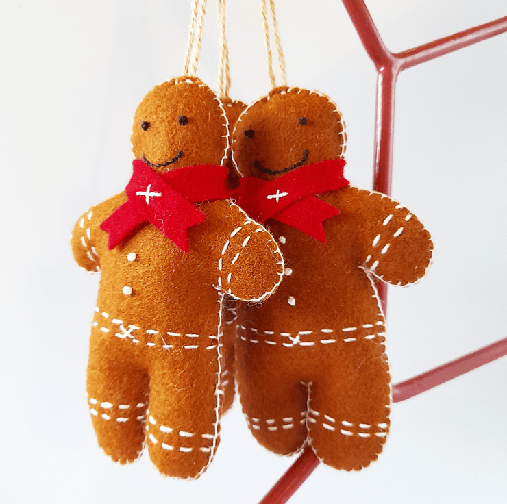 These handmade felt Gingerbread men tree decorations have been made from using 100% wool felt from the Wool felt Company, a UK based supplier. The embroidery thread used is Anchor Perle Cotton and they are filled with polyester toy filling. Then finished with a short natural jute string loop to allow them to be hung on a hook or a Christmas Tree.