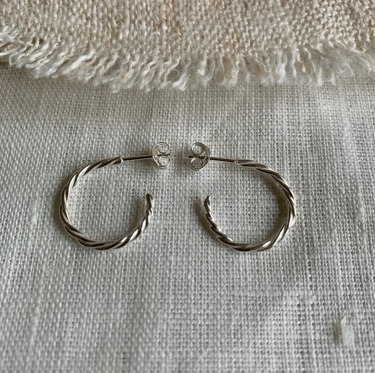 thin small to medium twisted open C shaped silver hoop earrings with a round profile. Hand formed in solid polished recycled silver wire with sterling silver posts and butterfly backs.