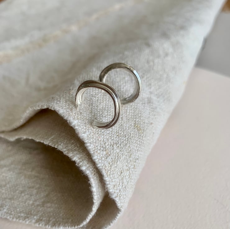 Small ridged texture organic shaped hoop earrings with a flat ribbed profile. Hand formed in solid polished recycled silver with sterling silver posts and butterfly backs.