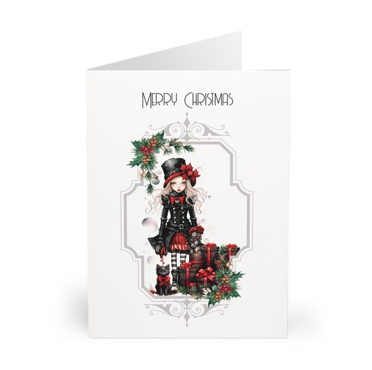 Struggling to find a card for the Goths in your life? This cute Christmas / Gothmas design features a blonde-haired Kawaii style Goth Girl dressed in Black Victorian clothes and stripey stockings. She wears an oversized top hat and has a little black cat and a pile of red-ribboned presents at her feet. The entire scene framed within an Art Nouveau frame sprinkled with holly and berries.