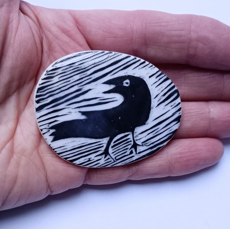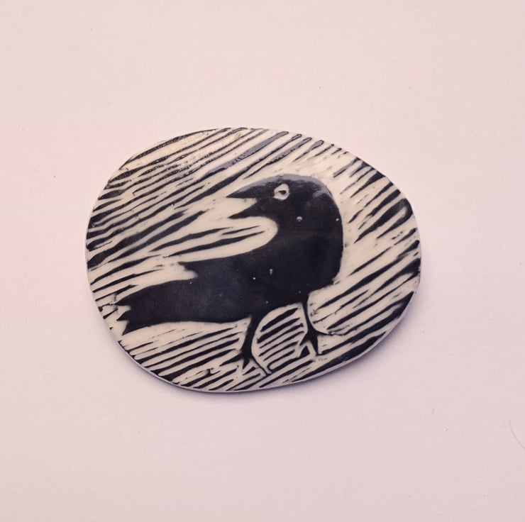 I'm a fan of the brooch, so I thought I'd make some. I'm also a fan of the crow so what to put on them wasn't exactly a difficult decision. They just seem to work so well, the solid crow shape, the black and white contrasting so nicely. Lovely.