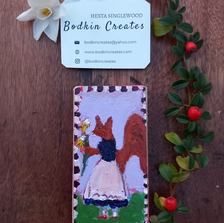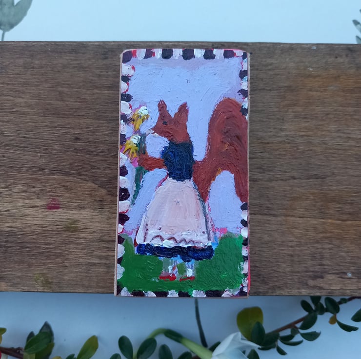 Collectable miniature paintings. In my signature style. Original tiny works of art. Have in a cluster. A small hand painted gift. Beautifully packaged. Signed and lightly varnished. With a little hook on the back. 8cm tall. 4cm wide.