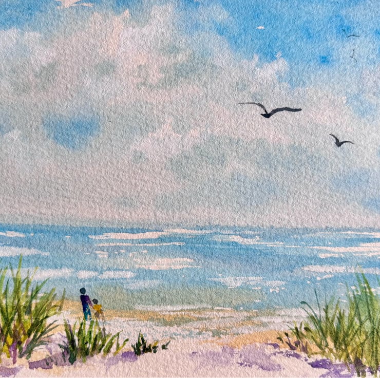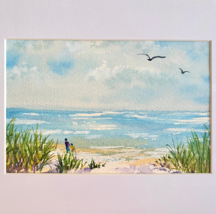 A 7” x 5” original watercolour in a mount capturing the beautiful colours of summer at the beach. Painted on quality rough watercolour paper for more texture