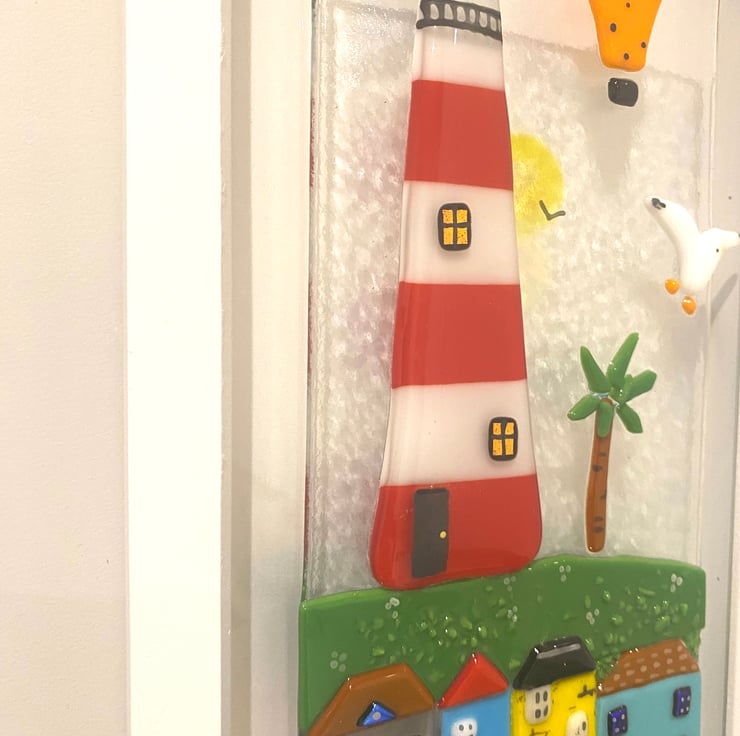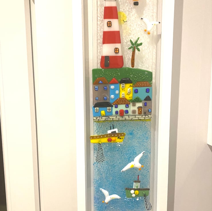 I just adore creating my fused glass coastal scenes always containing seagulls and little fishing boats . This particular scene is based on the iconic smeatons tower in my home town of plymouth . Each of my scenes are unique and only one of them . Unlike many other fused glass artists I only make one of each picture so you can be reassured you are getting a one of a kind original glass art picture.