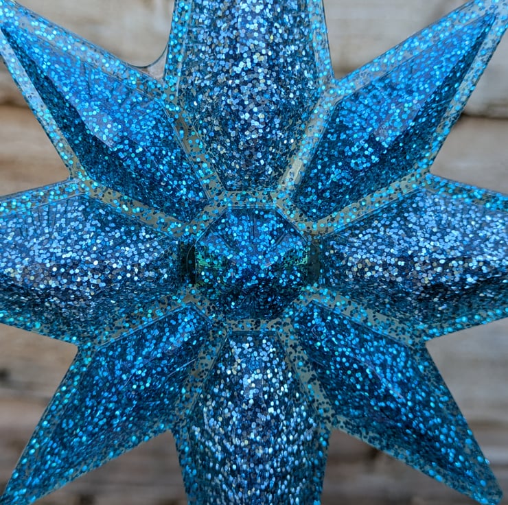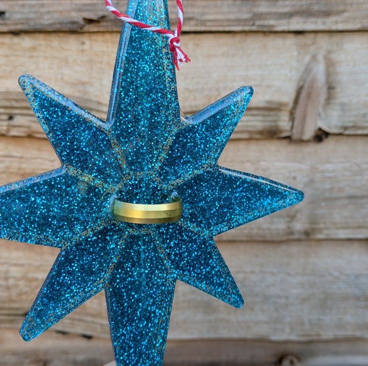 The top of the star has a hole in which to thread ribbon for hanging the star but I have also embedded a ring in the centre of the back so that it can slot onto the top of the tree.