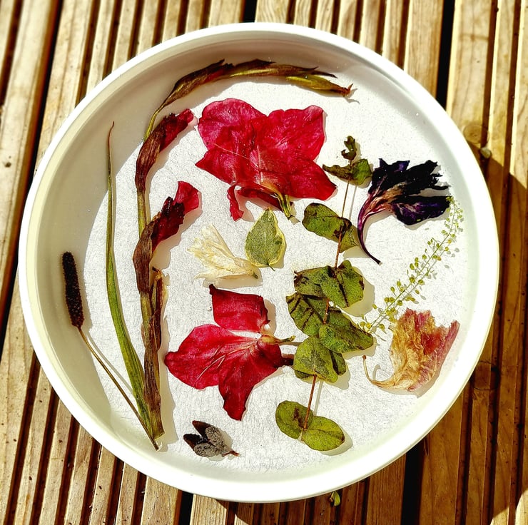 The tray is crafted using epoxy resin, a clear, durable material that allows for intricate designs & preserves the natural beauty of flowers. The base is made of white metal (not by me, not hand-crafted). Inside the resin are real dried flowers, petals, & leaves arranged artistically in circular patterns to complement the rotational design. The flowers are sealed into resin, giving a stand glass-like finish while protecting the florals from damage or fading over time.