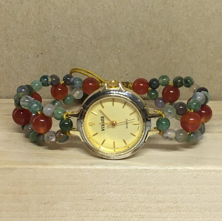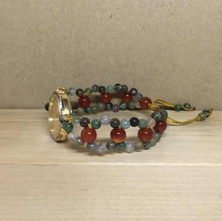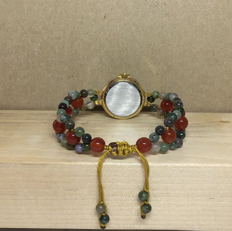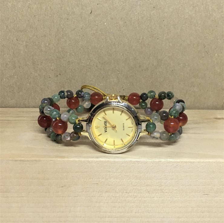 Upcycled Women Wrist Watch With Red Agate And Aventurine In Assorted Colours Beaded Adjustable Bracelet - Handmade Gift