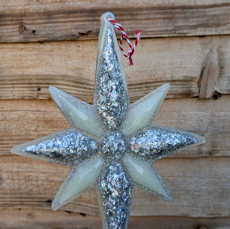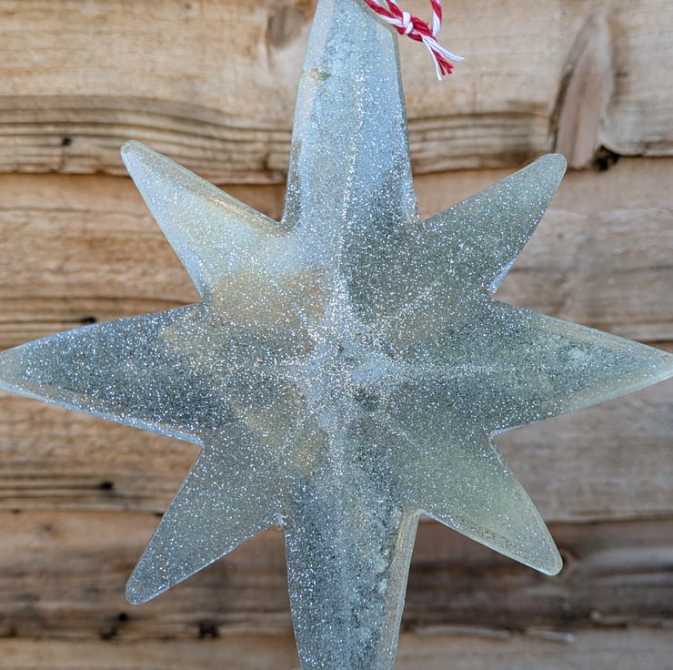 It is approximately 23cm long by 17cm wide and 1.5cm deep. Made from eco friendly, non toxic and cruelty free resin, this star will stop people in their tracks to admire your beautiful tree.