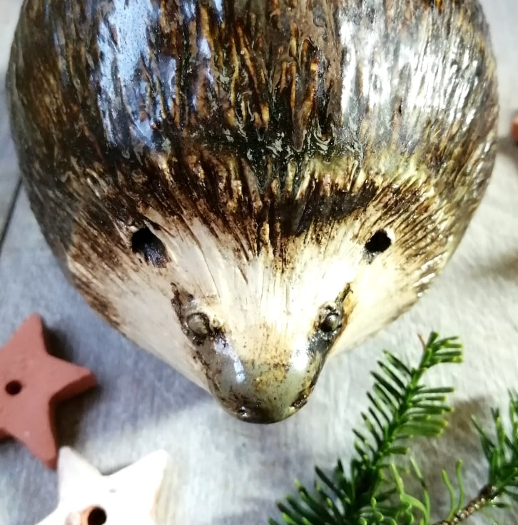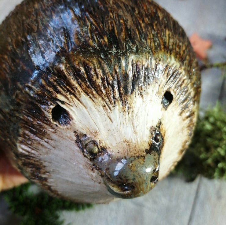 After carefull drying the hedgehog iis placed in the kiln for an initial firing, before being heavily stained with dark metallic oxides, with further layers of a deep rich brown glossy glaze, with delicate touches of a mossy green where the glaze s thicker, enhancing the form, define facial features and give a contrast between the harder, spiky texture of the body and sofer area around the edge of the face.