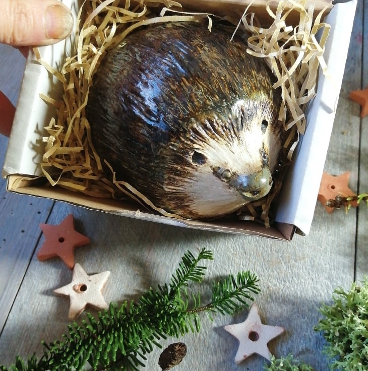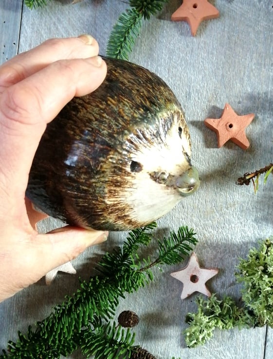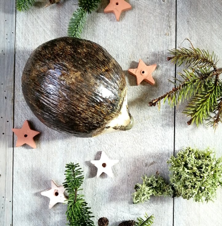 This ceramic Hedgehog has been hand modelled, using a light coloured robust stoneware clay to form two pinch pots joined together, then furher hand modeling to create the body of the animal defining the body, head and nose, with further texture and details added as the clay becomes firmer.The classic form of this Woodland creature starting to emerge.