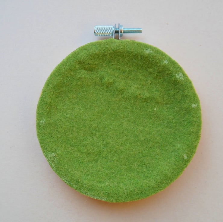 Materials: Wooden hoop, fabric, felt, glue, cord, cotton thread, and acrylic paints.