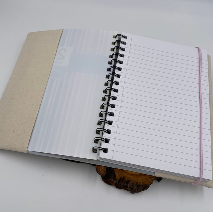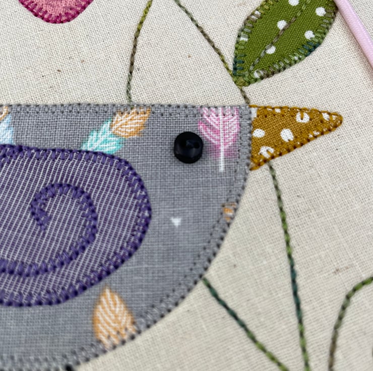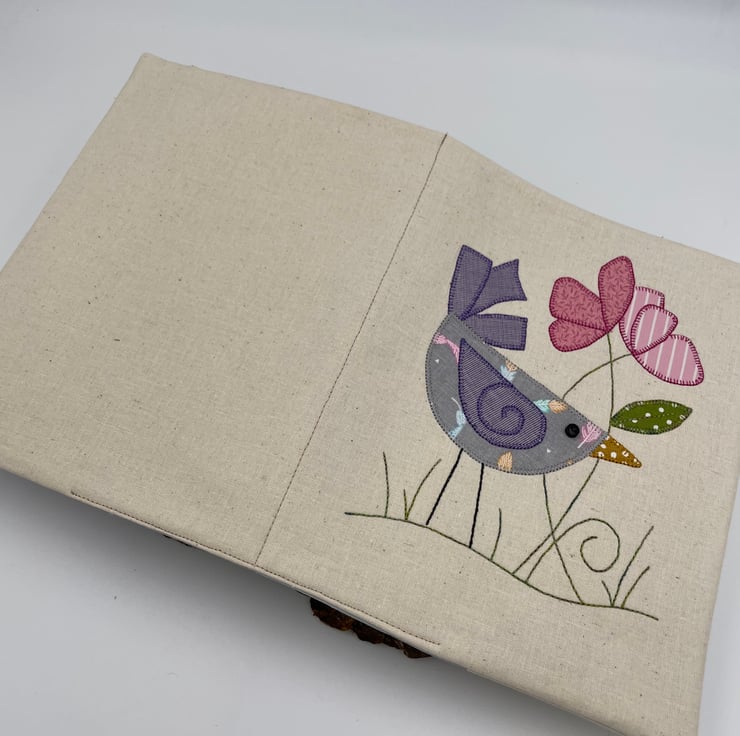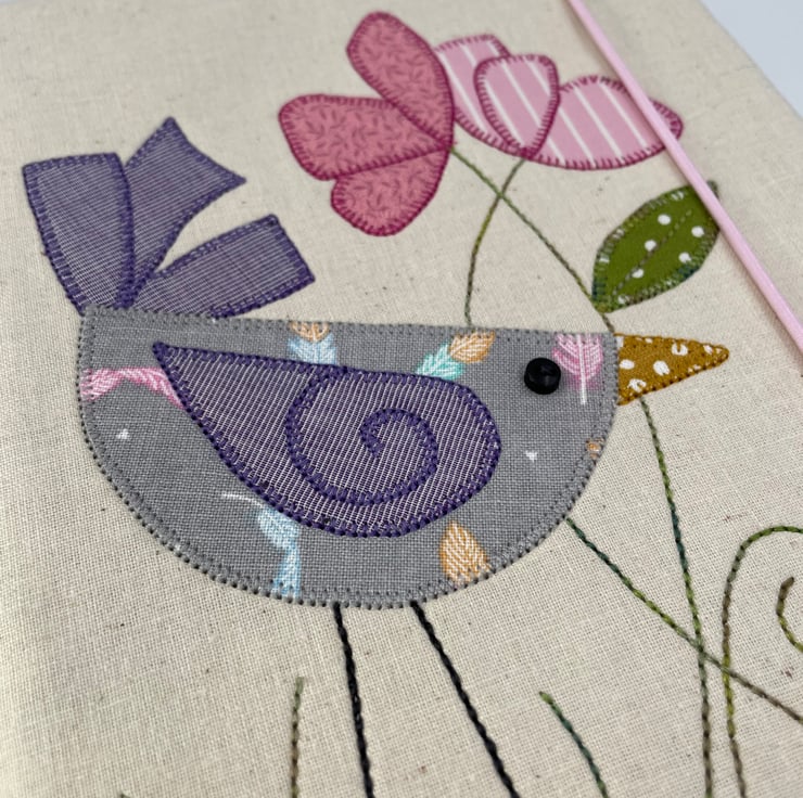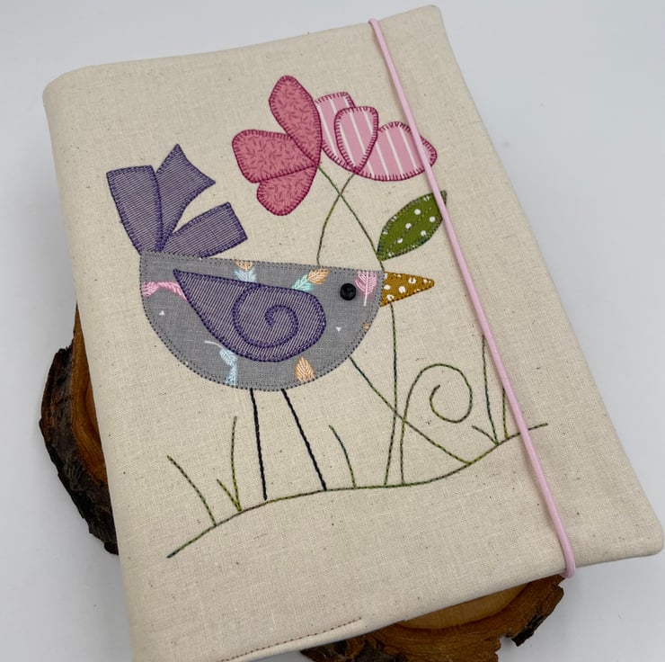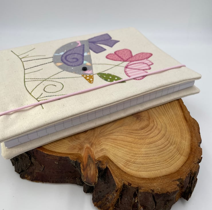 A soft fabric notebook cover featuring a bird and flower design, appliquéd with pretty pink and lilac fabrics. Handmade with care to brighten up your everyday notes or journaling. With elastic closing.