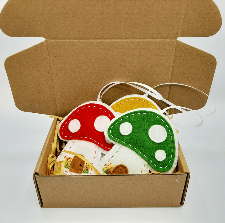 These colourful felt decorative hanging toadstools are handsewn using 100% wool felt from a UK supplier and hand embroidered using high quality embroidery threads.