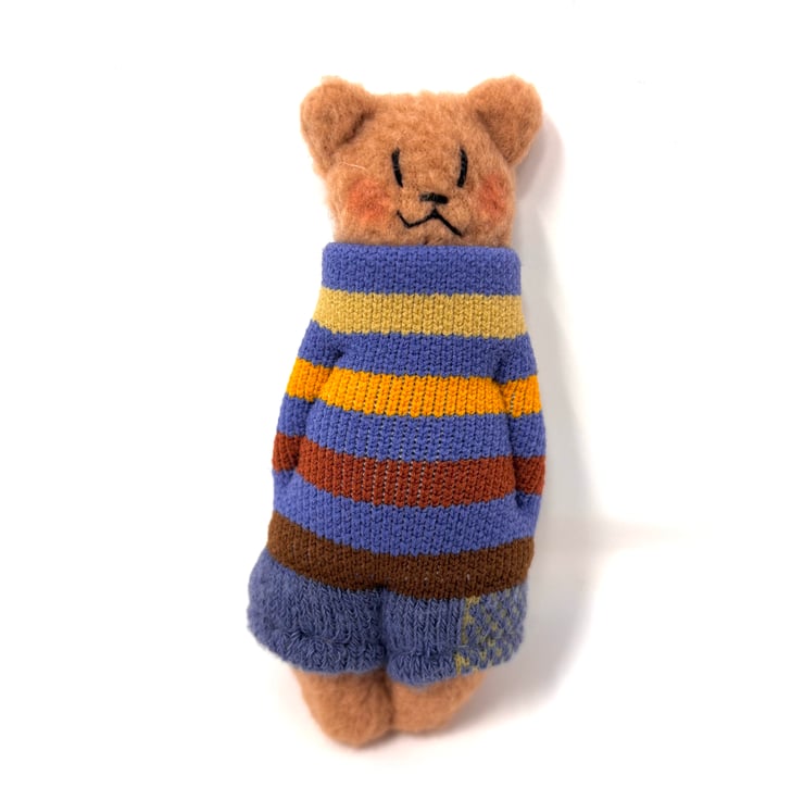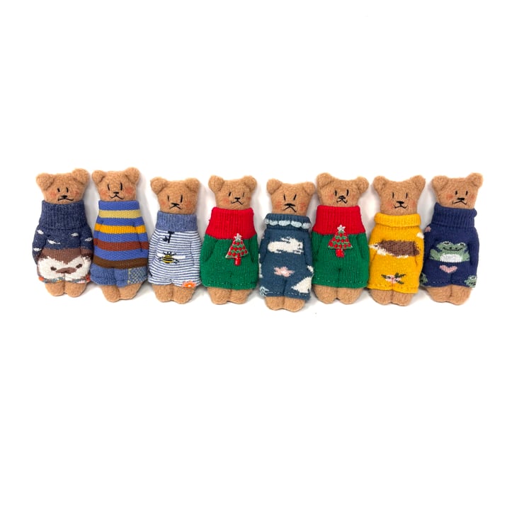 Each teddy is unique and usually have jumpers made from recycled clothes or old unused socks. Their faces are hand stitched and they are filled with polyester toy filling. They each have a wooden Beary Tales button stitched to their bum.