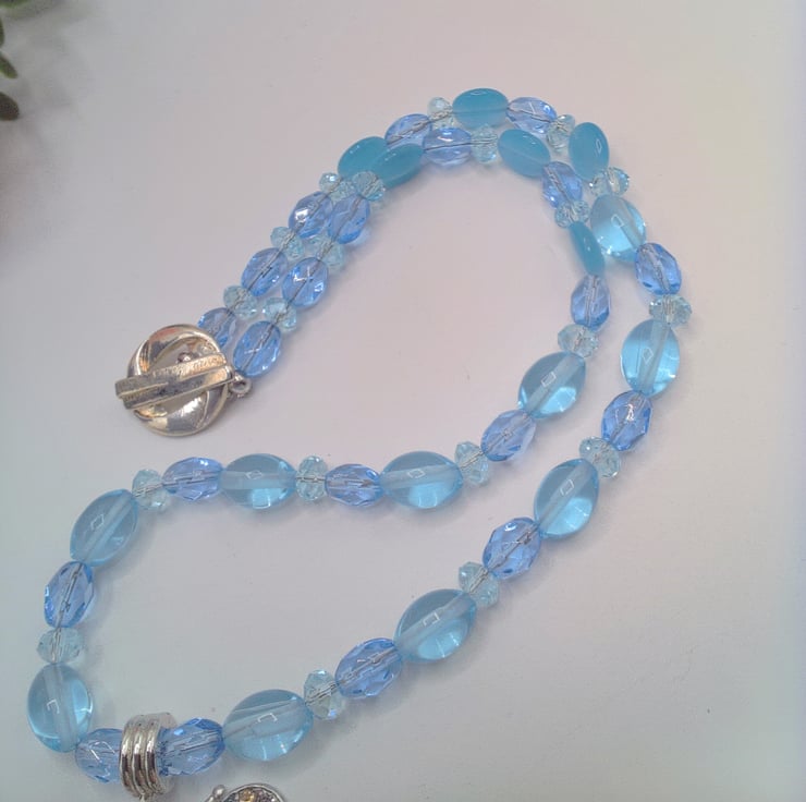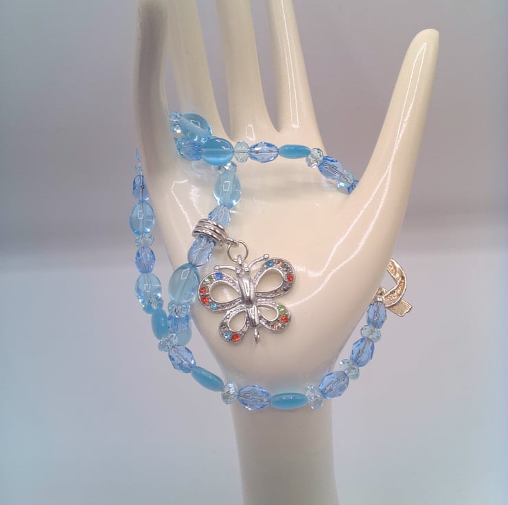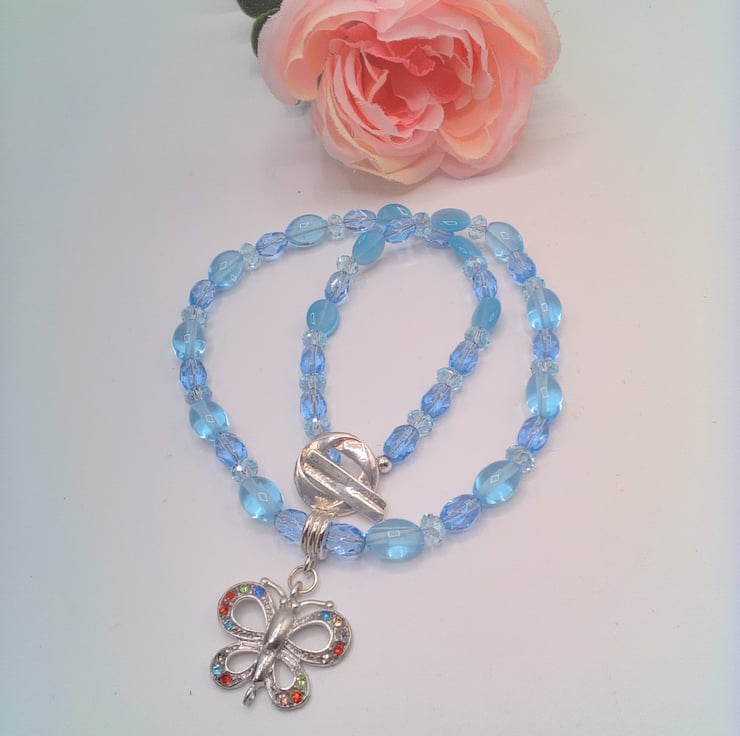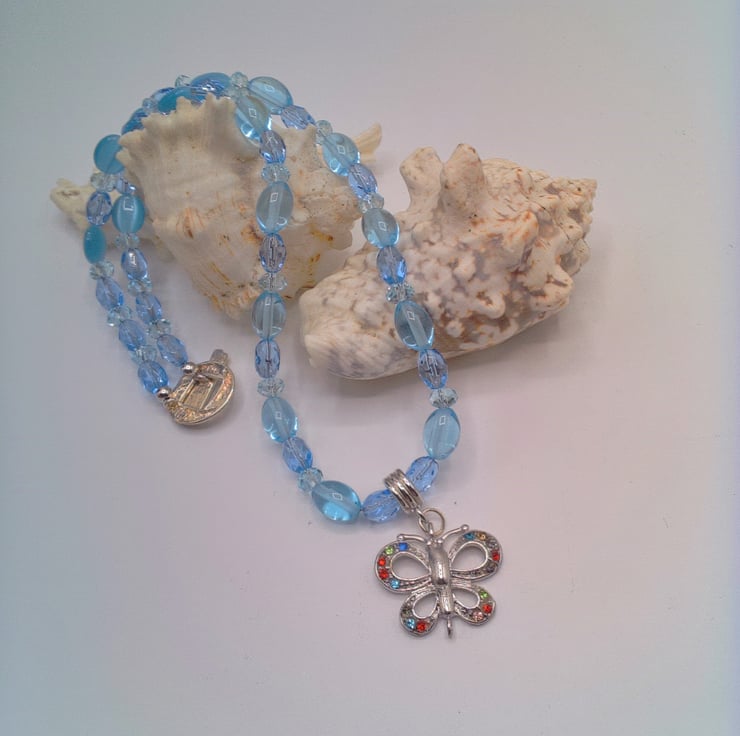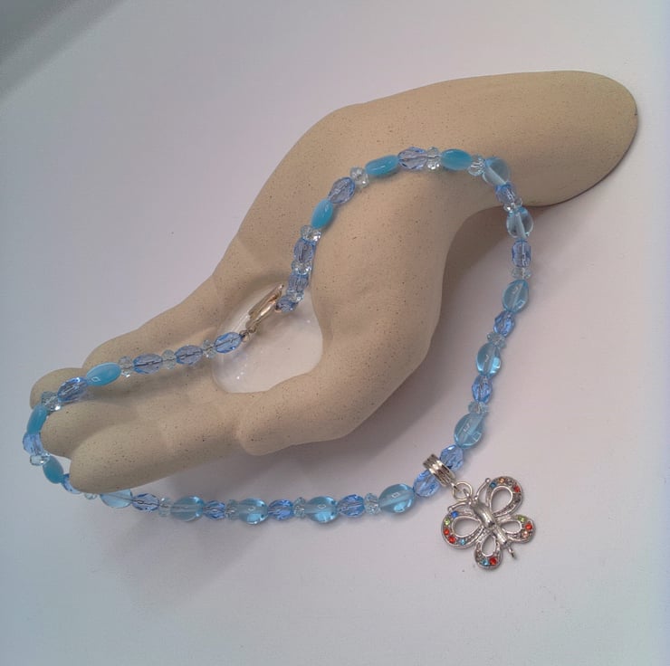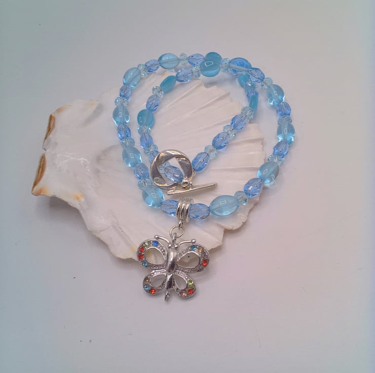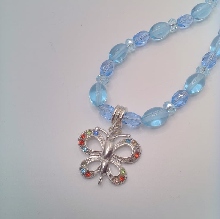 Multi Colour Rhinestone Butterfly Pendant on a Blue Bead and Crystal Necklace, Jewellery, Accessories, Birthday Gift, Anniversary Gift