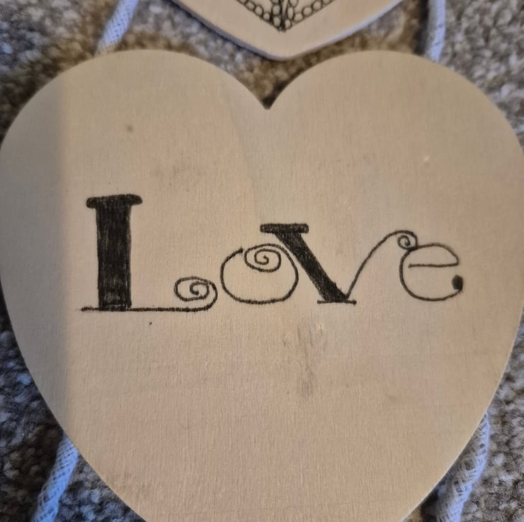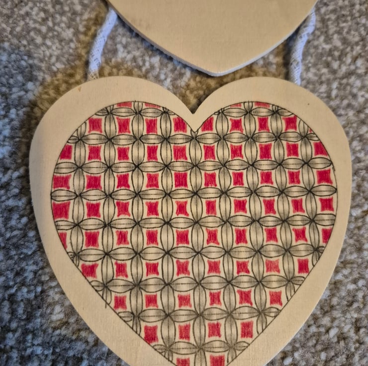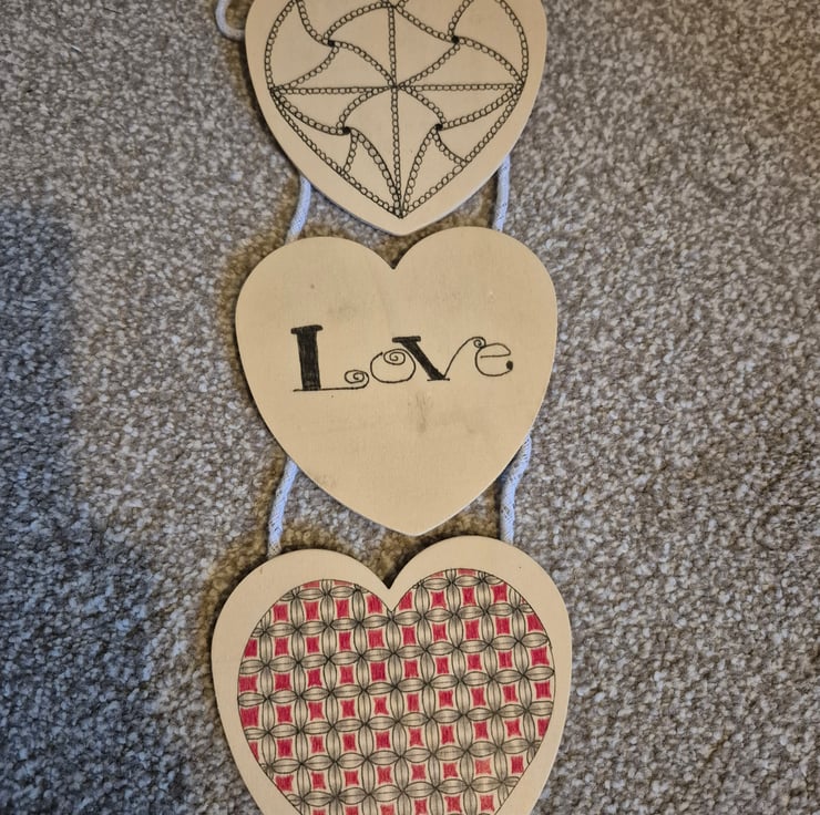 Beautiful one of a kind wooden wall hanging made up of 3 hearts ea h one with a different design