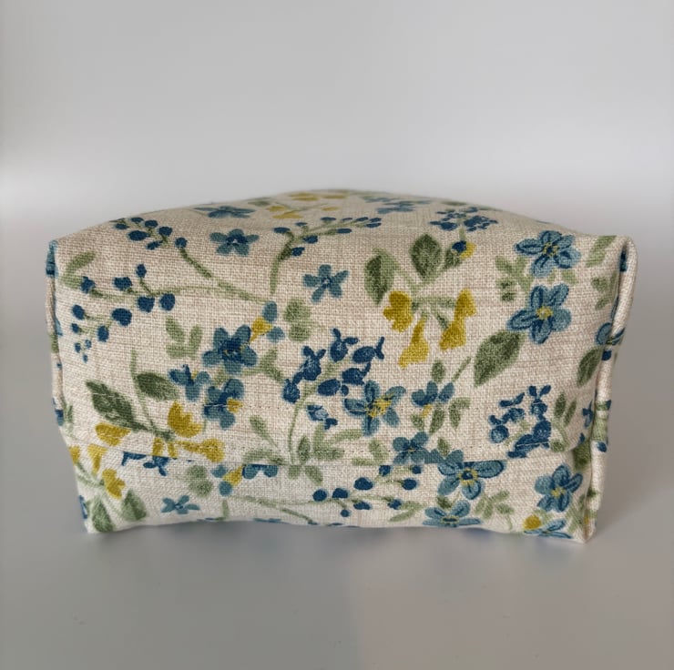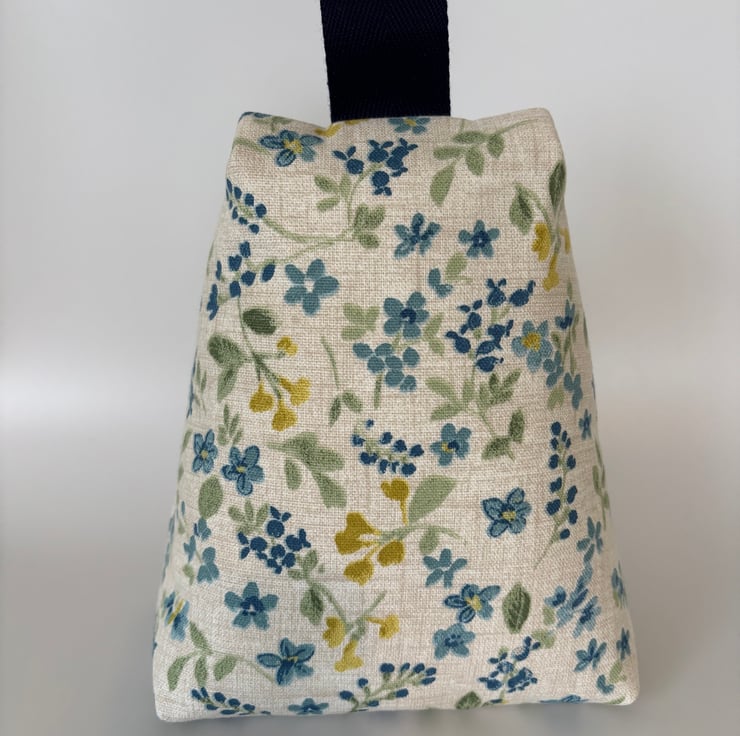 Handmade cotton fabric doorstop in a floral print with blue, yellow and green flowers.