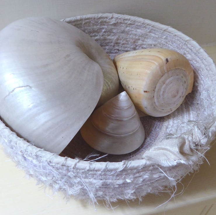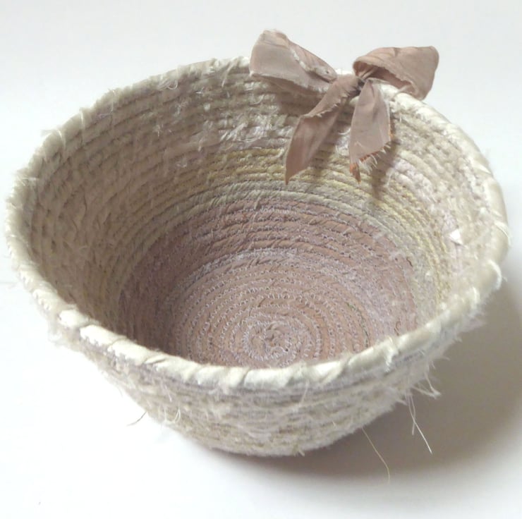 This cream silk coiled basket is ideal for any room as the neutral colour won't clash. Sorry, the lighting has changed the colour somewhat in the pictures but I would be happy to supply more pictures if it would be helpful.